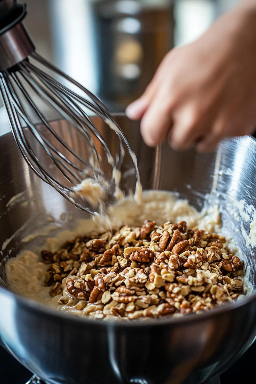 Fold in Add-ins: Add oatmeal and chopped walnuts, mixing on low until just combined.
