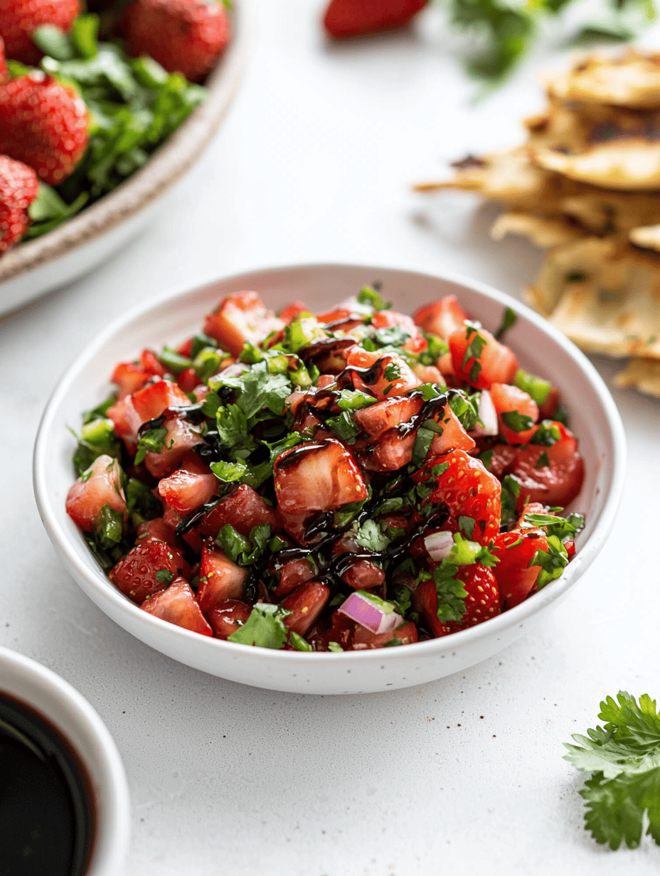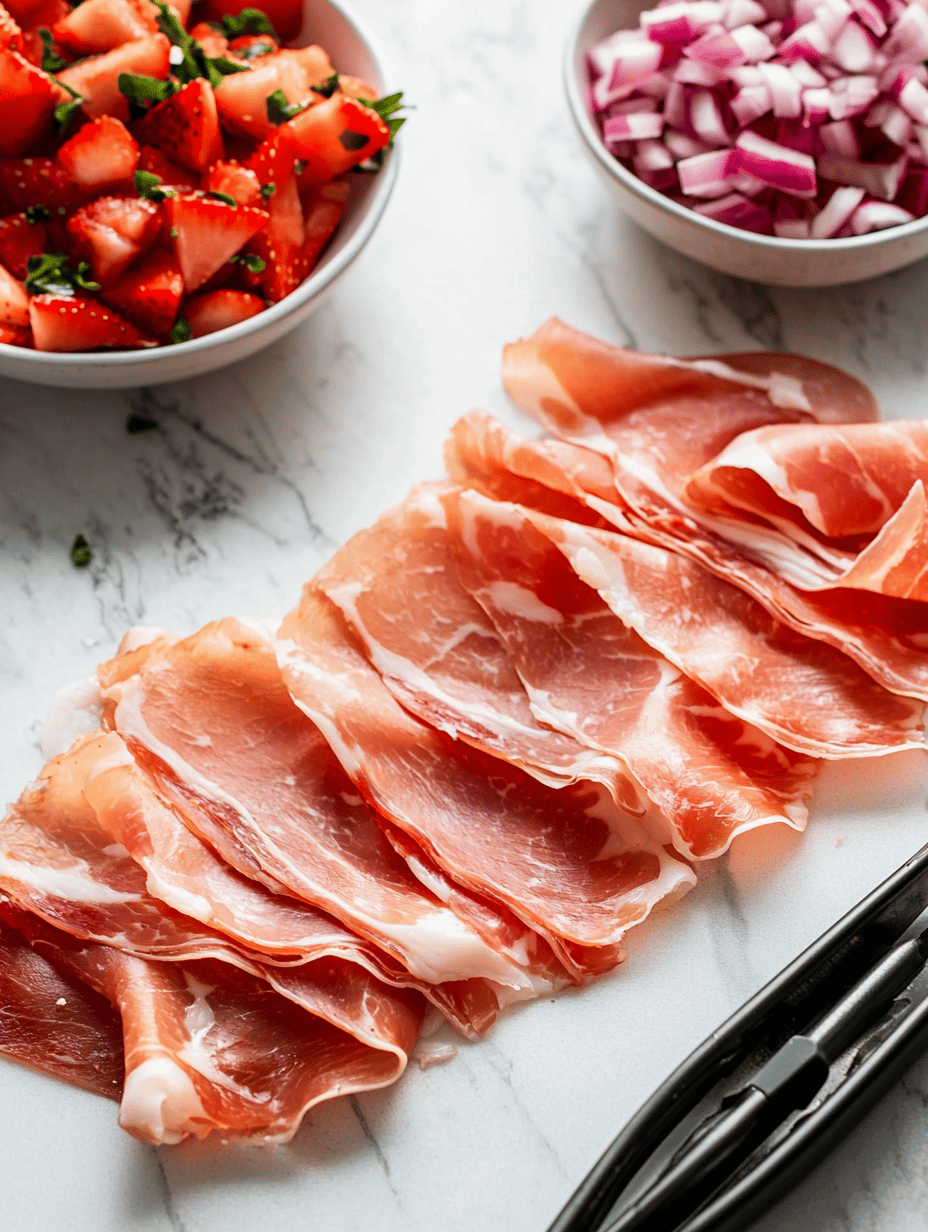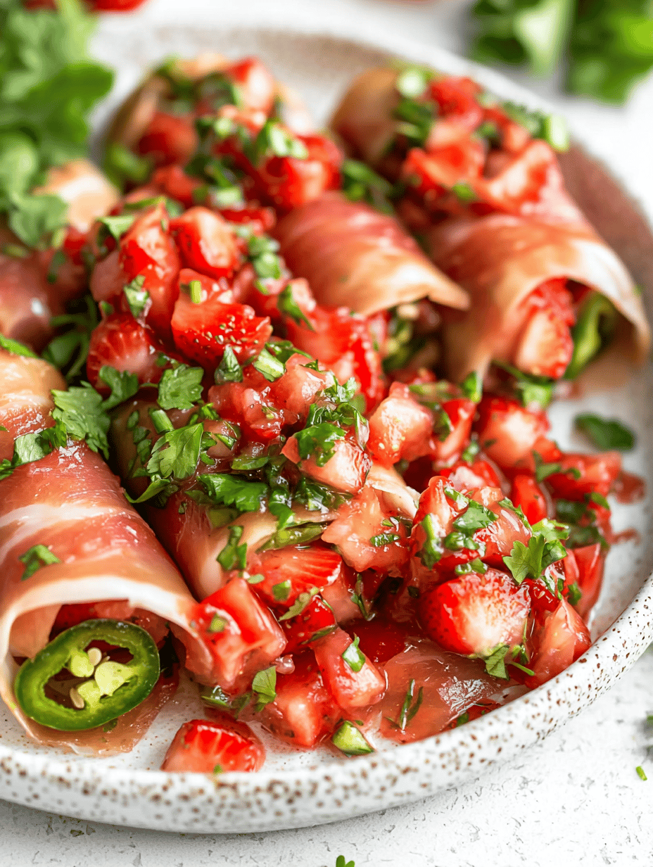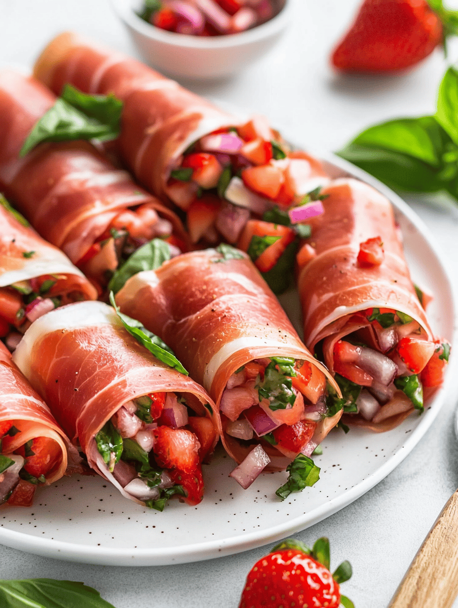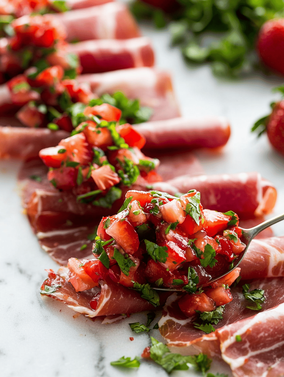 This dish features a vibrant, sweet and spicy strawberry salsa made by chopping fresh strawberries and mixing them with chili, lime, and herbs. The salsa is served alongside delicate prosciutto slices, which are wrapped around complementary ingredients to create elegant, bite-sized appetizers with a balance of crispness and tenderness.