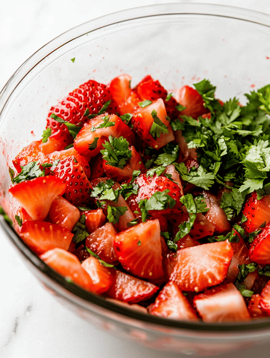 Start by placing your chopped strawberries in a mixing bowl. Add the finely minced chili, lime juice, and chopped cilantro, then gently stir to combine. The salsa should look vibrant and fragrant, with the berries slightly softened and coated in spice and citrus aromas.