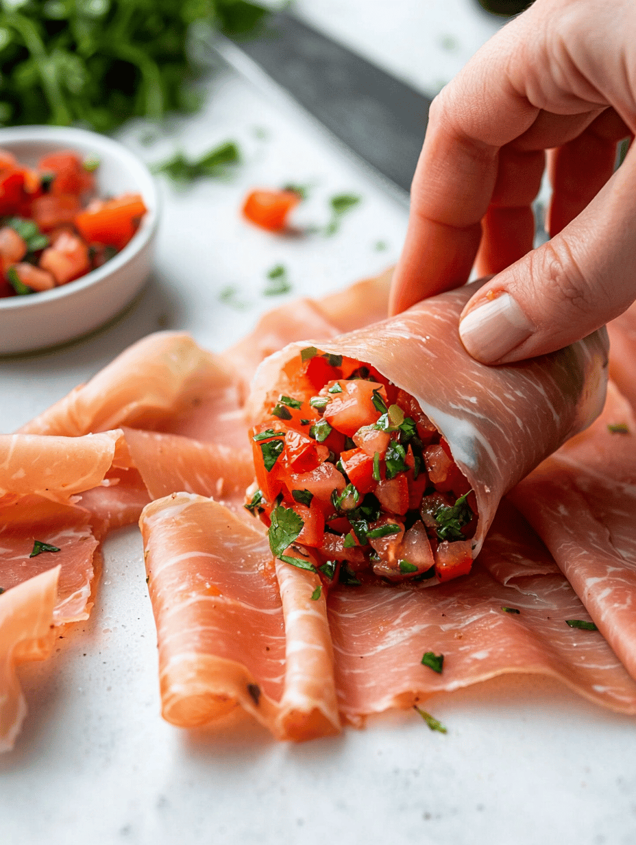 Gently fold or roll the prosciutto slices around the filling, creating little bundles or wraps. Aim for a tight roll that keeps the salsa inside but reveals a hint of the colorful filling at the opening.