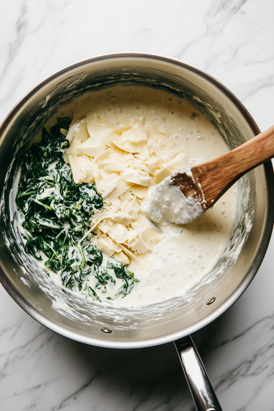 In a mixing bowl, combine sour cream, mayo, cream cheese, drained spinach, artichoke hearts, garlic, and ¾ cup of parmesan cheese. Mix until smooth.