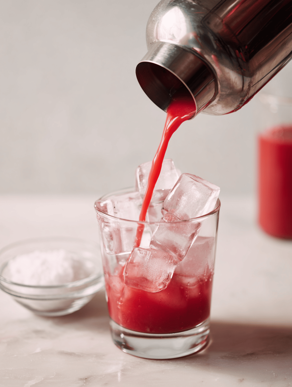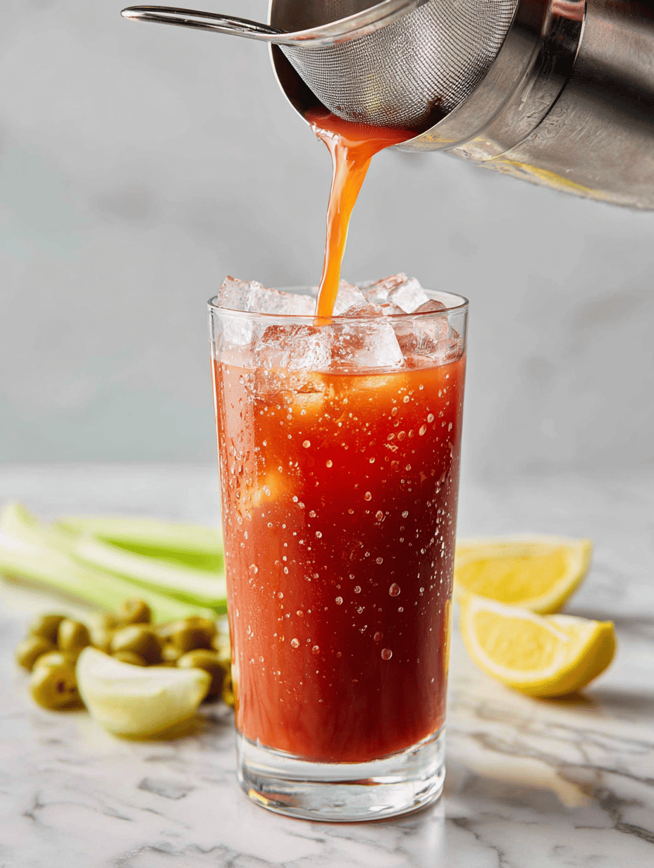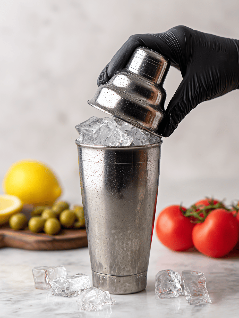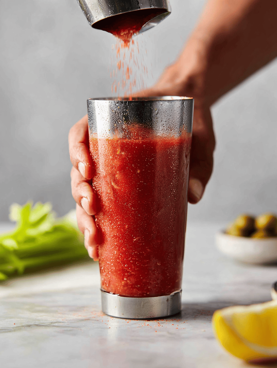 Pour the tomato juice into the shaker, adding it over the ice to keep everything cold.