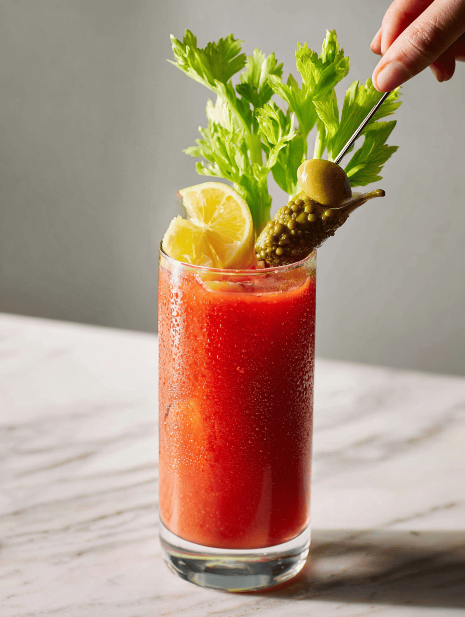 Garnish with a celery stalk, a lemon wedge, and a pickle or olive skewered on a spooky pick or skewer for that creepy Halloween vibe.