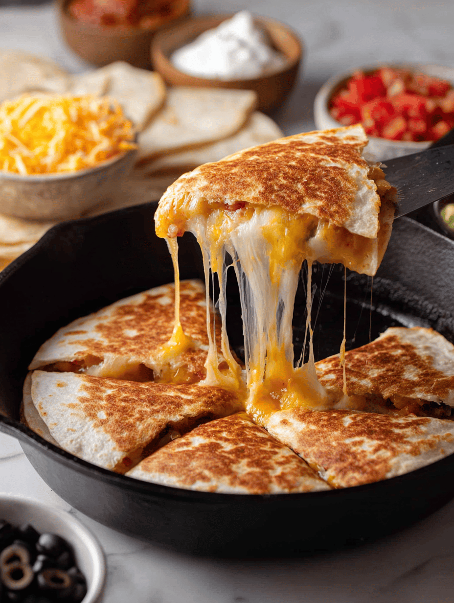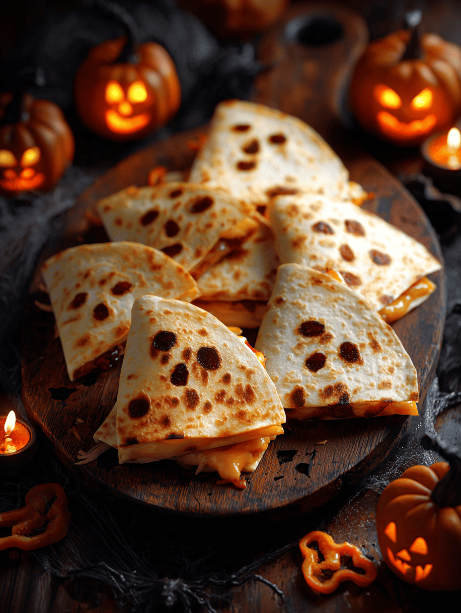 Remove the quesadilla from the skillet and let it rest for a minute, then cut into wedges, revealing the gooey, cheesy interior and fun decorations.