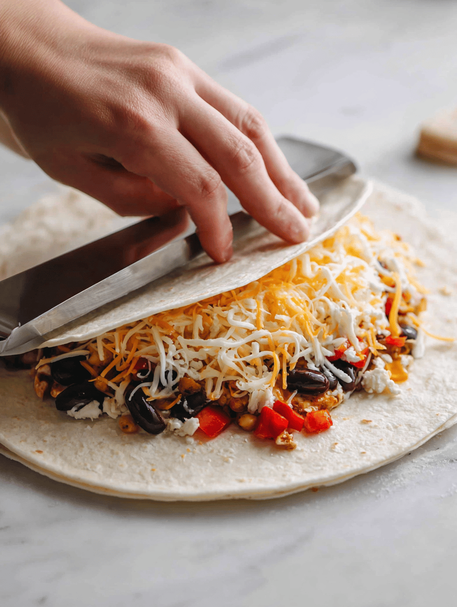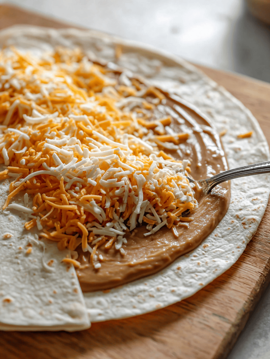 Lay a tortilla flat on a cutting board and spread a thin layer of refried beans over half of it, then sprinkle generously with shredded cheese.