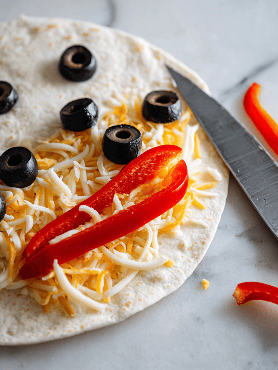 Use sliced black olives or beans to create eyes, placing them on the cheese layer, and add a strip of red bell pepper for a mouth, shaping a spooky face.