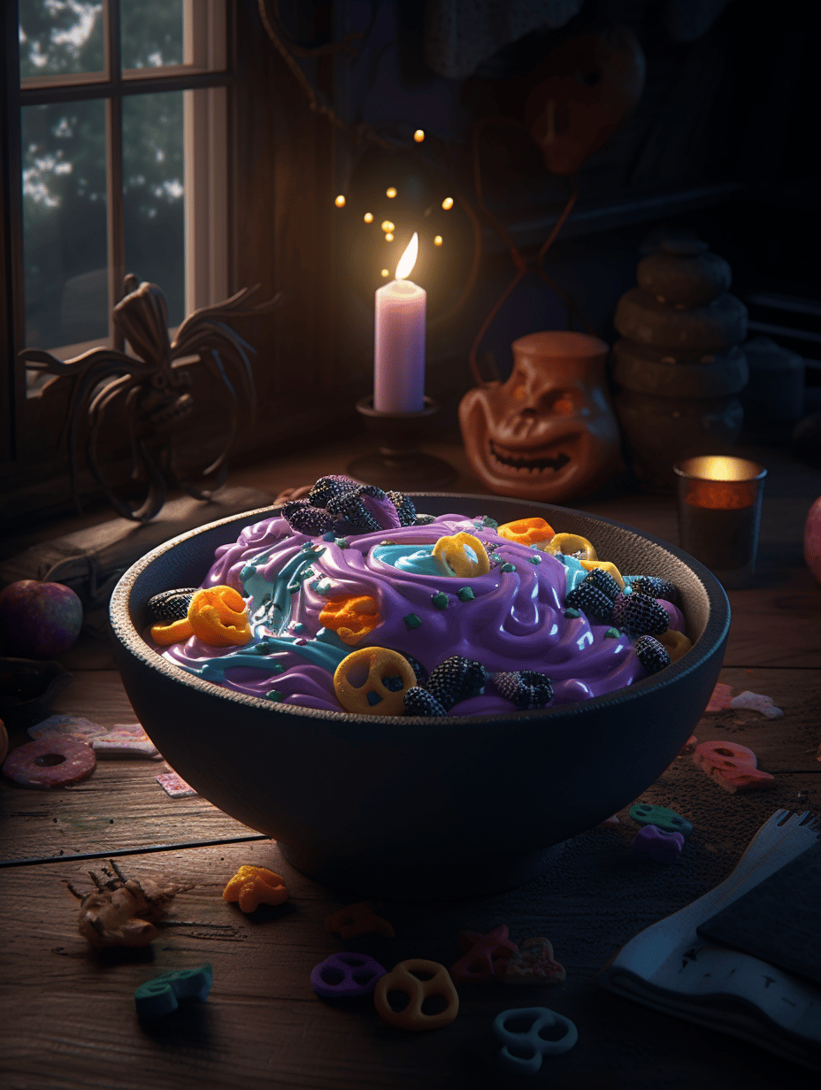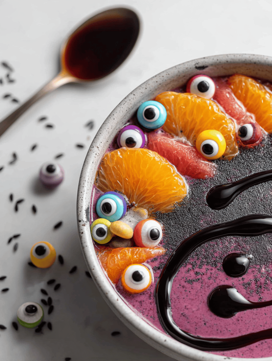 Decorate the bowl with colorful toppings—place edible eyes, orange segments, and drizzle dark honey to make creepy faces or patterns.