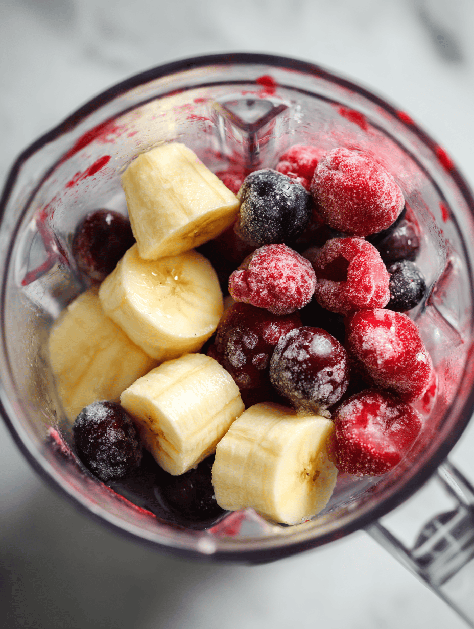 Place the frozen bananas and berries into your blender, ready to transform into a smooth, icy base.