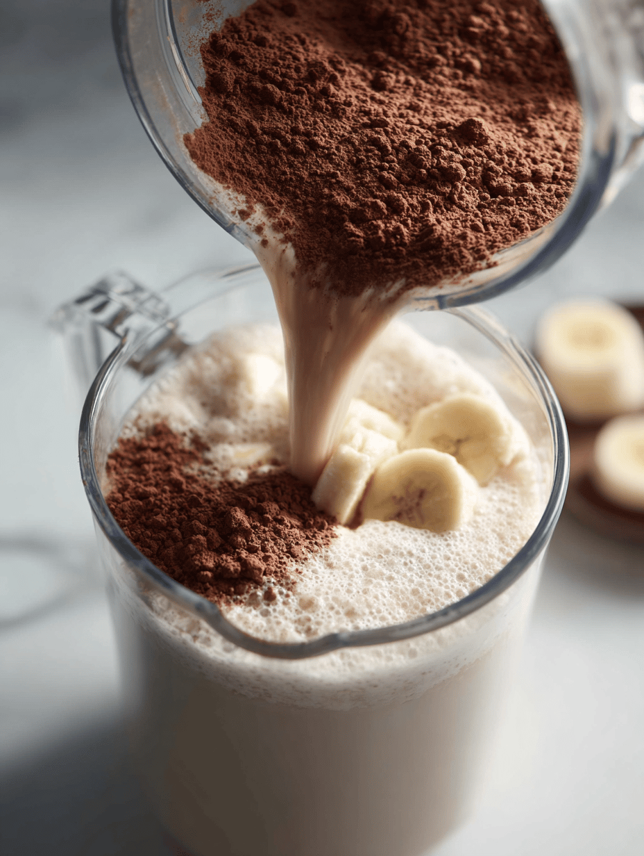 Add the almond milk and cacao powder to the blender, creating a rich and velvety mixture when blended.