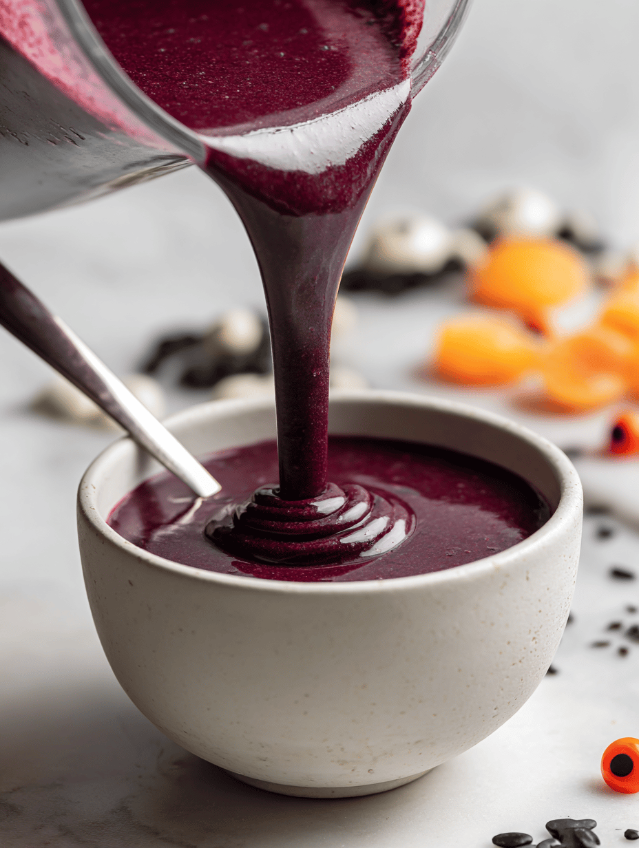 Step back and admire your creepy creation—ready to serve and enjoy your Halloween-themed smoothie bowl!