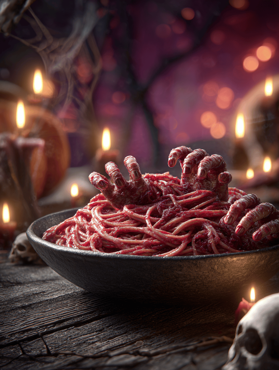 Arrange the crispy sausage slices on a serving platter, standing them upright to resemble fingers reaching out. Drizzle the bloody sauce over the sausage fingers and spaghetti for a gory effect.