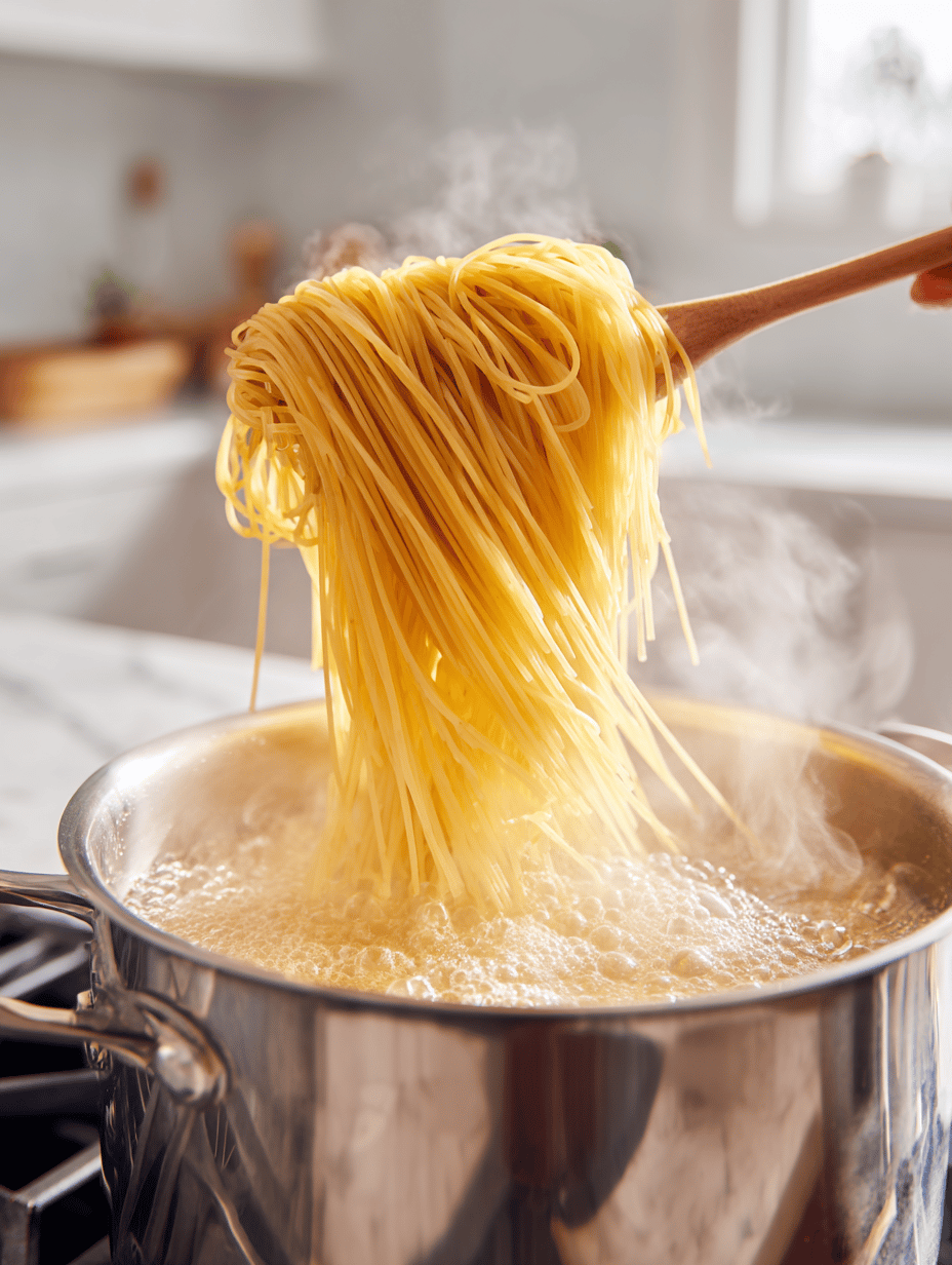 Bring a large pot of salted water to a rolling boil, then add the spaghetti. Cook until just al dente, about 8-10 minutes, then drain and set aside.