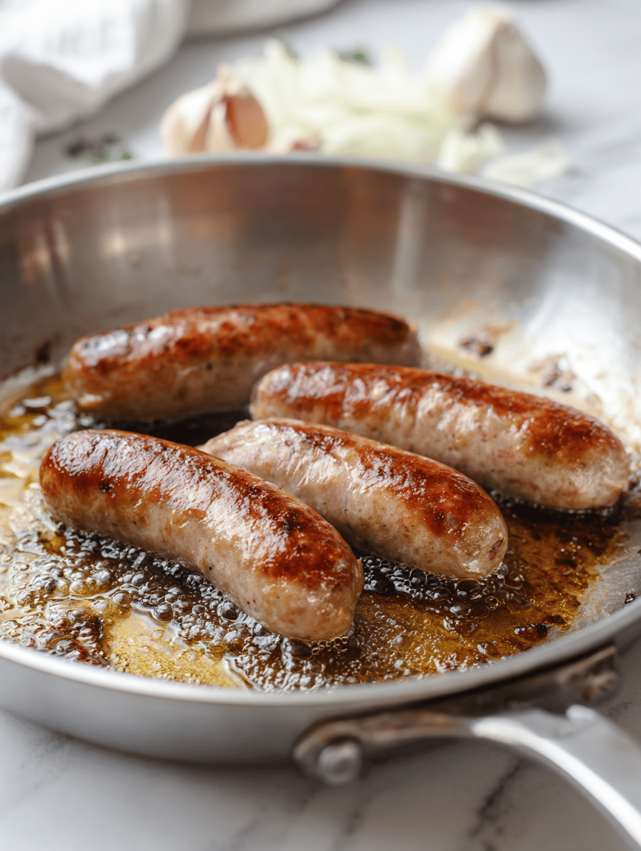 While the pasta cooks, heat a tablespoon of oil in your skillet over medium-high heat. Add the sausage links and cook until browned and sizzling, about 8 minutes.