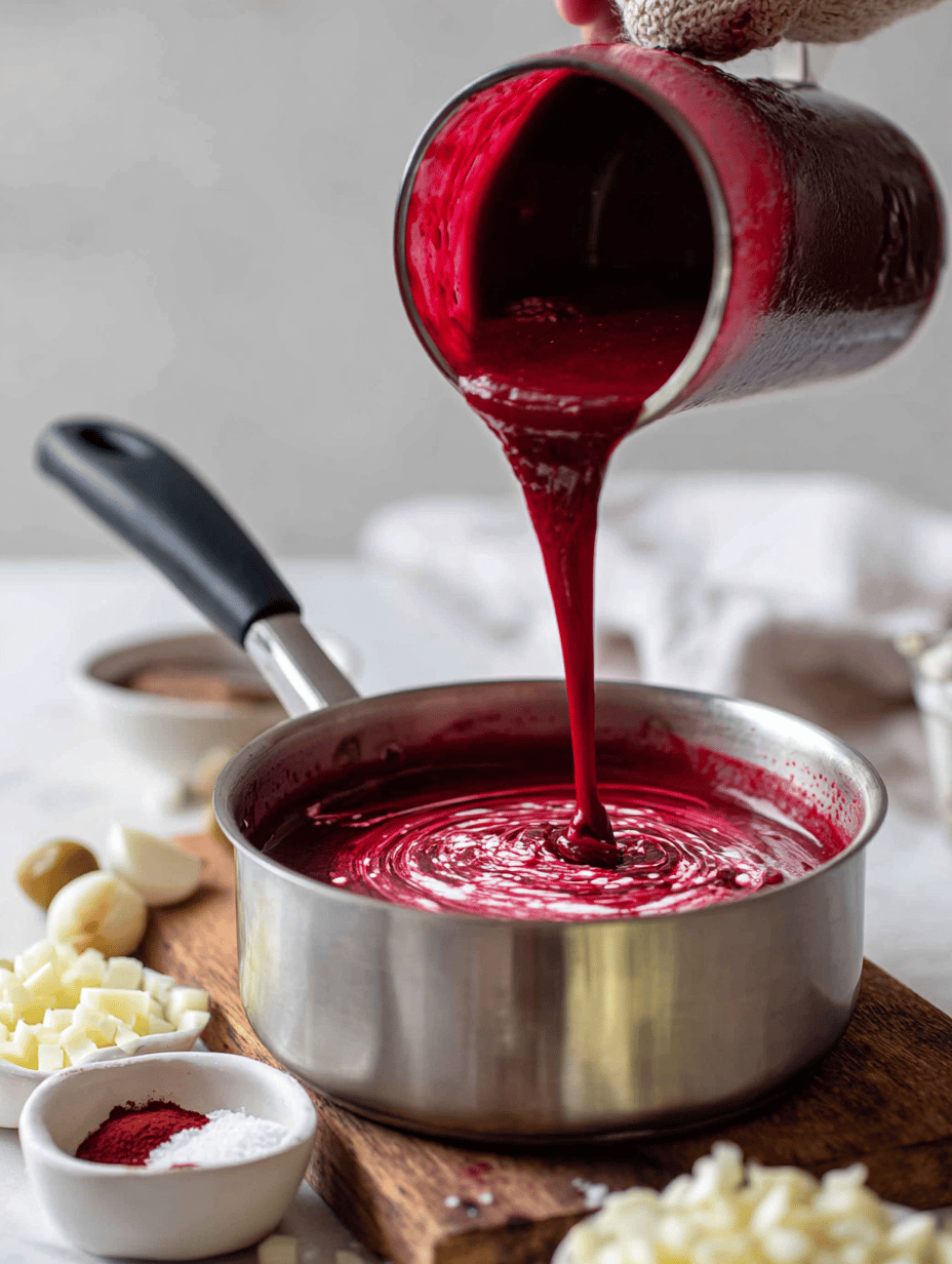 Reduce the heat to medium and pour in your blood-red sauce, mixing tomato sauce with beet juice or food coloring. Let it simmer gently for 5 minutes until thickened and vibrantly red, filling the kitchen with a rich, savory aroma.