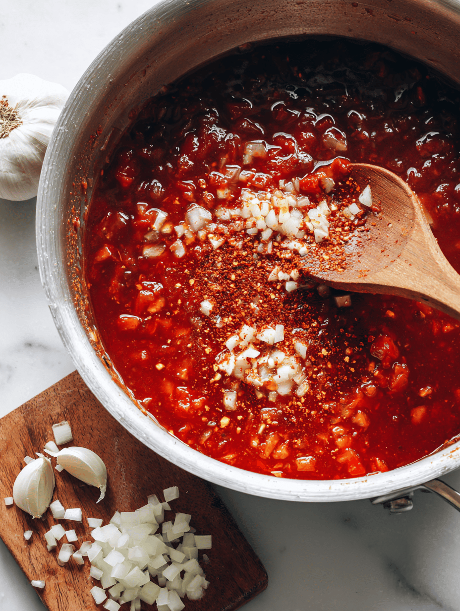 Add minced garlic, chopped onion, and smoked paprika to the sauce, stirring to combine. Cook for another 2-3 minutes until fragrant and the sauce is deepening in color.