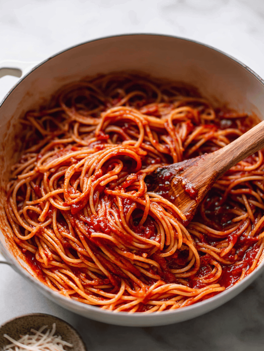 Toss the cooked spaghetti into the sauce, stirring thoroughly to coat every strand. Keep warm on low heat while you prepare the sausage fingers.