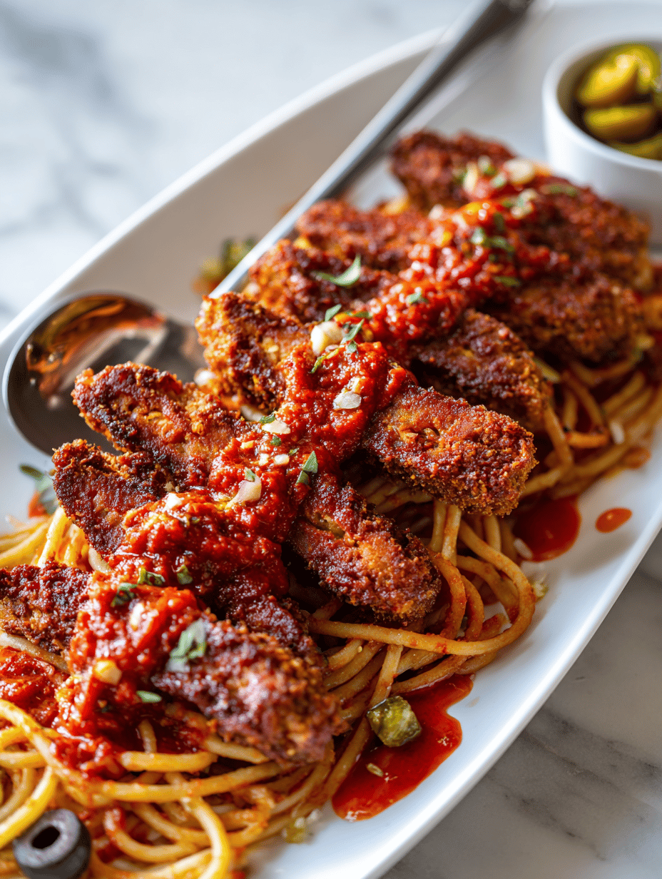 This playful Halloween dish transforms classic spaghetti into a spooky spectacle by incorporating crispy sausage fingers and blood-red sauce. The recipe involves boiling pasta, frying sausage slices into fingers, and drizzling a vibrant, gory sauce for a fun, creepy presentation with a savory, smoky flavor and crispy textures.