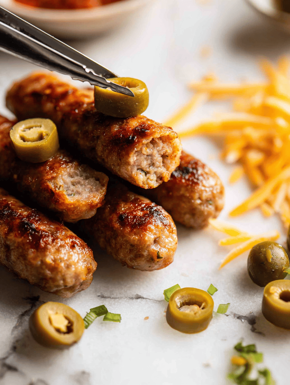 Add small slices of olive as eyes on the sausage fingers, and sprinkle shredded cheese or jalapeños if desired for extra fun and flavor.