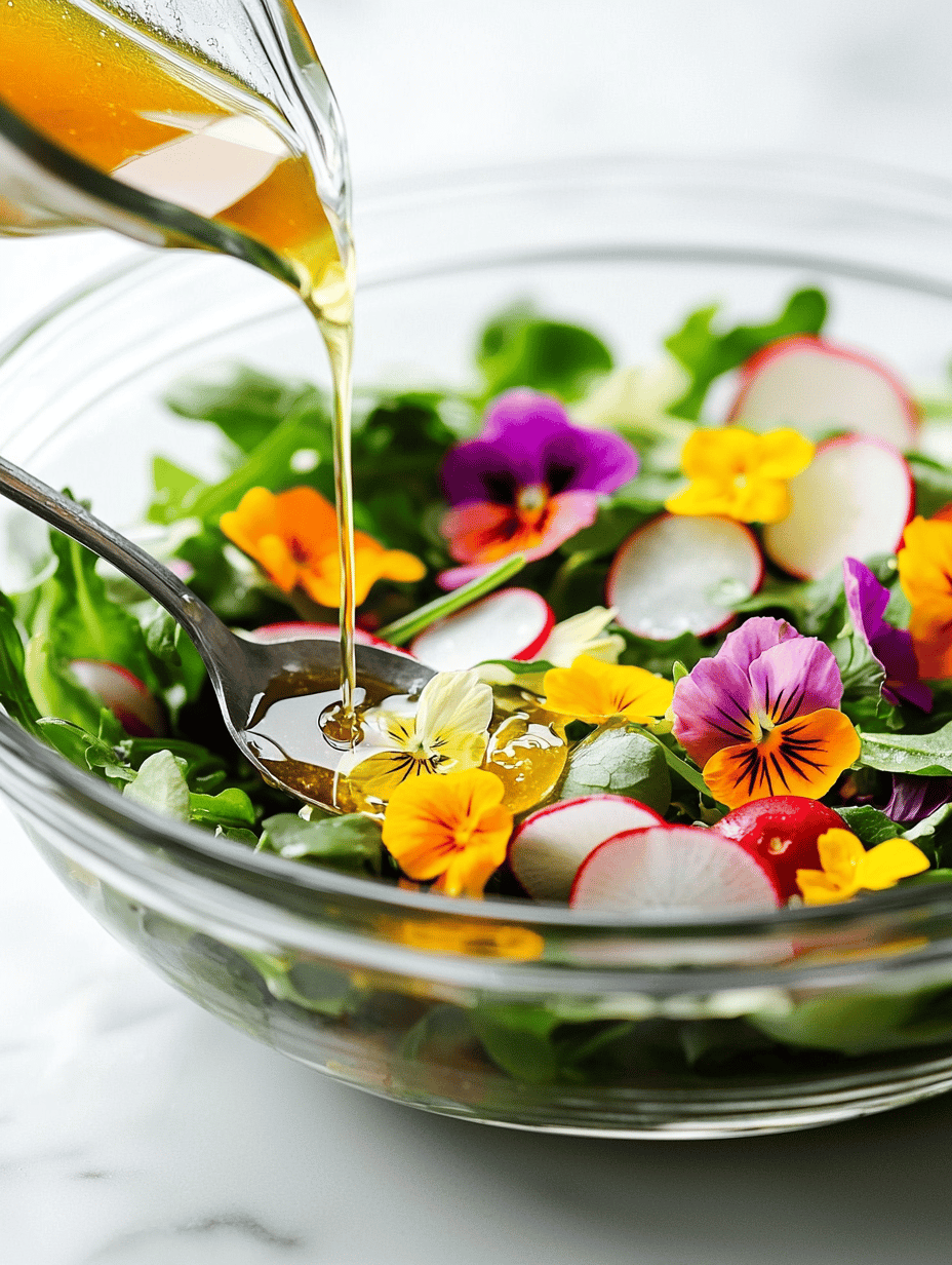 • Drizzle the citrus vinaigrette over the assembled salad, starting with a few spoonfuls and adding more as needed. Toss gently to coat all ingredients evenly without crushing the flowers or greens.