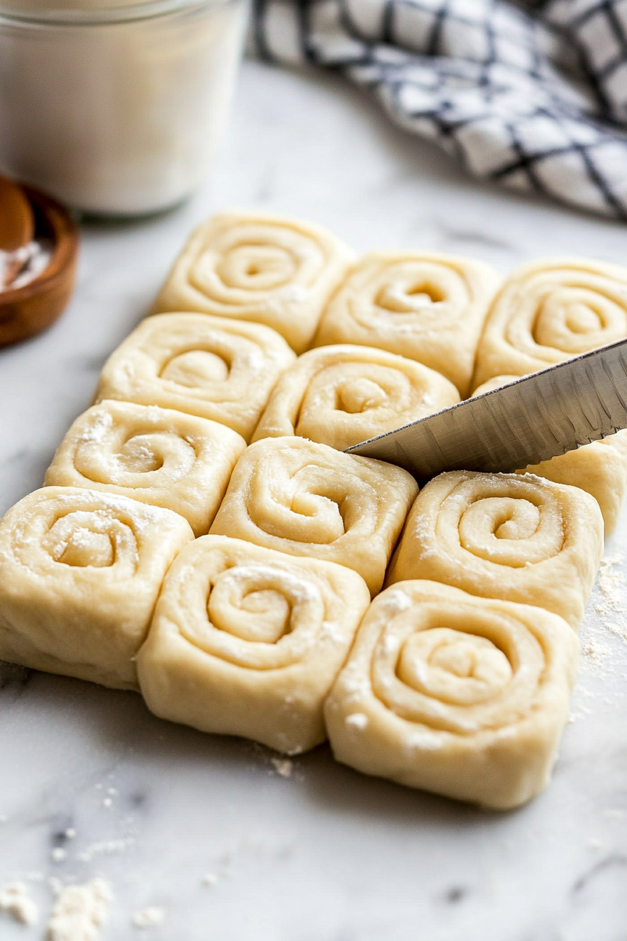 Roll up the dough, pinch the seam to seal, and cut into 12 equal rolls.