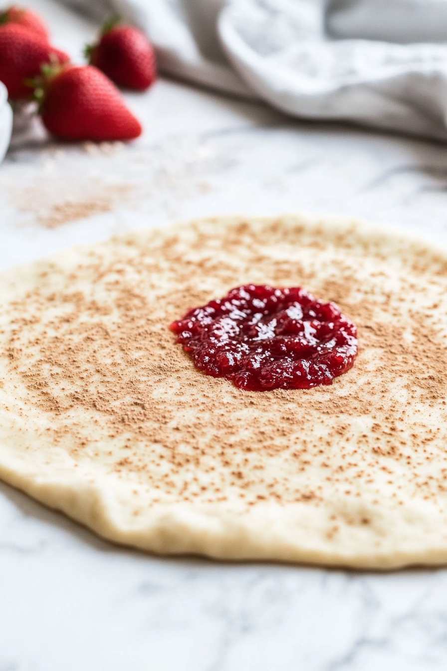 Roll dough into a 15×10 inch rectangle. Spread strawberry jam, sprinkle with cinnamon, and top with chopped strawberries.