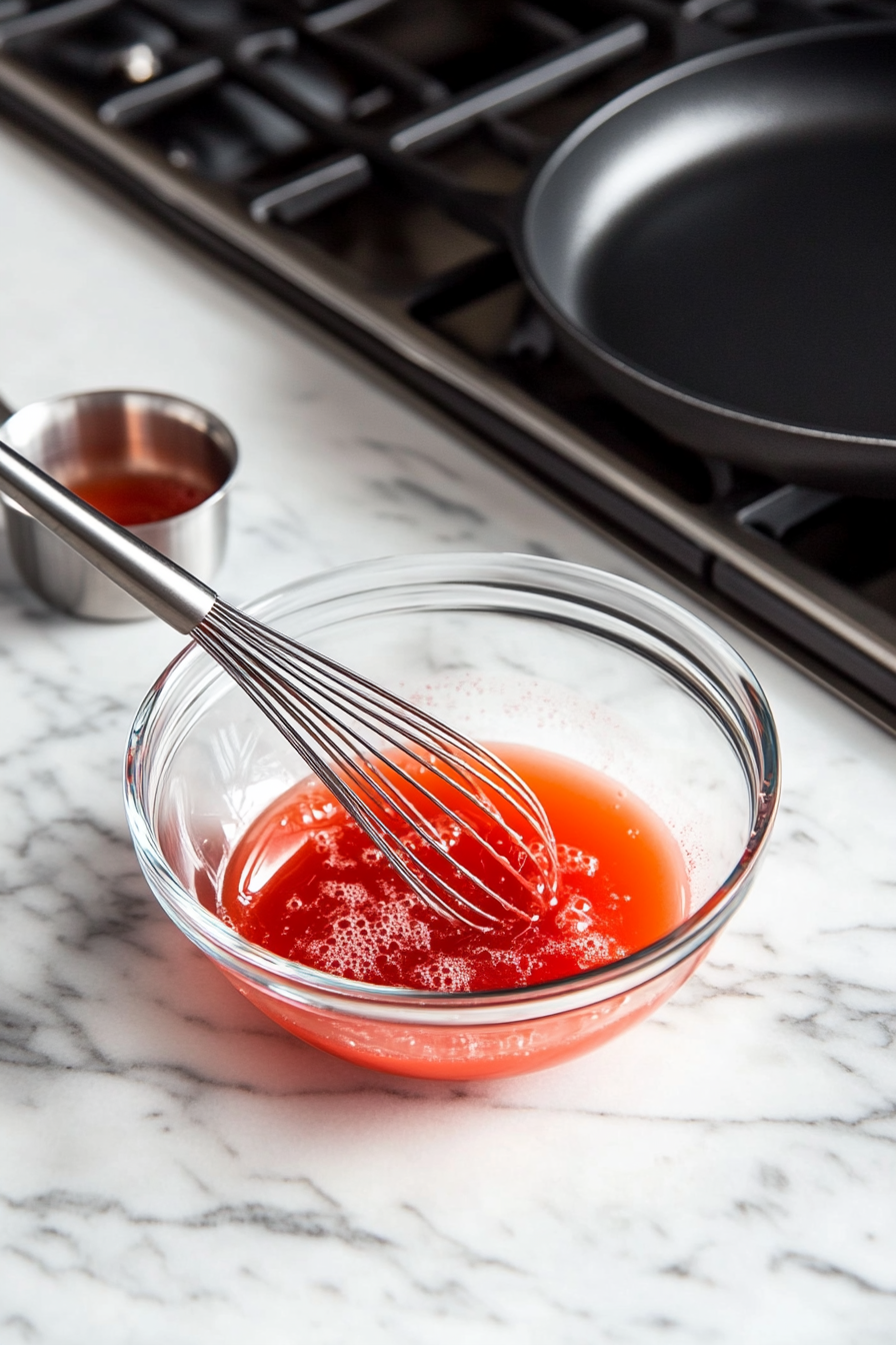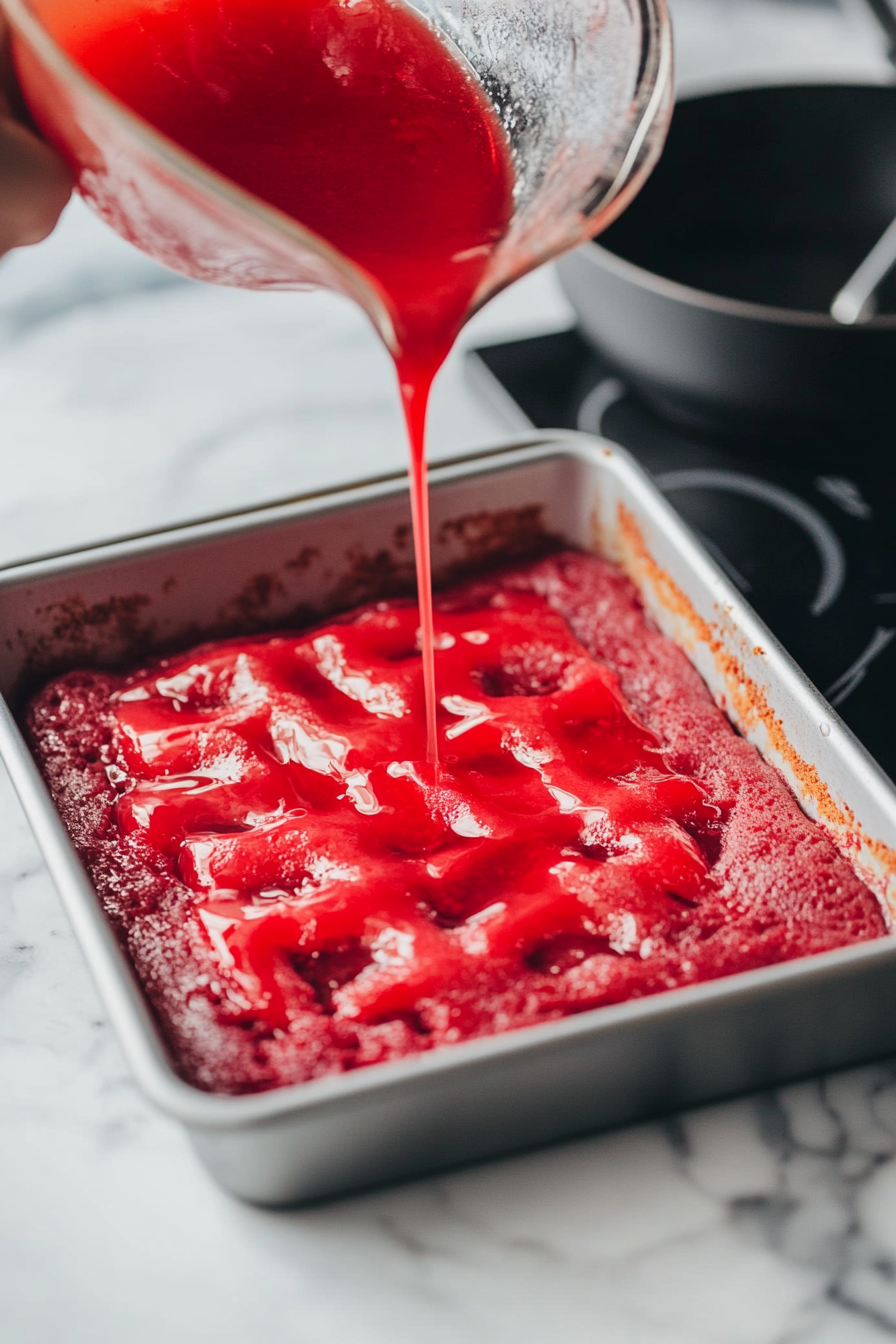 Slowly pour the Jello mixture over the cake, ensuring it soaks into all the holes.
