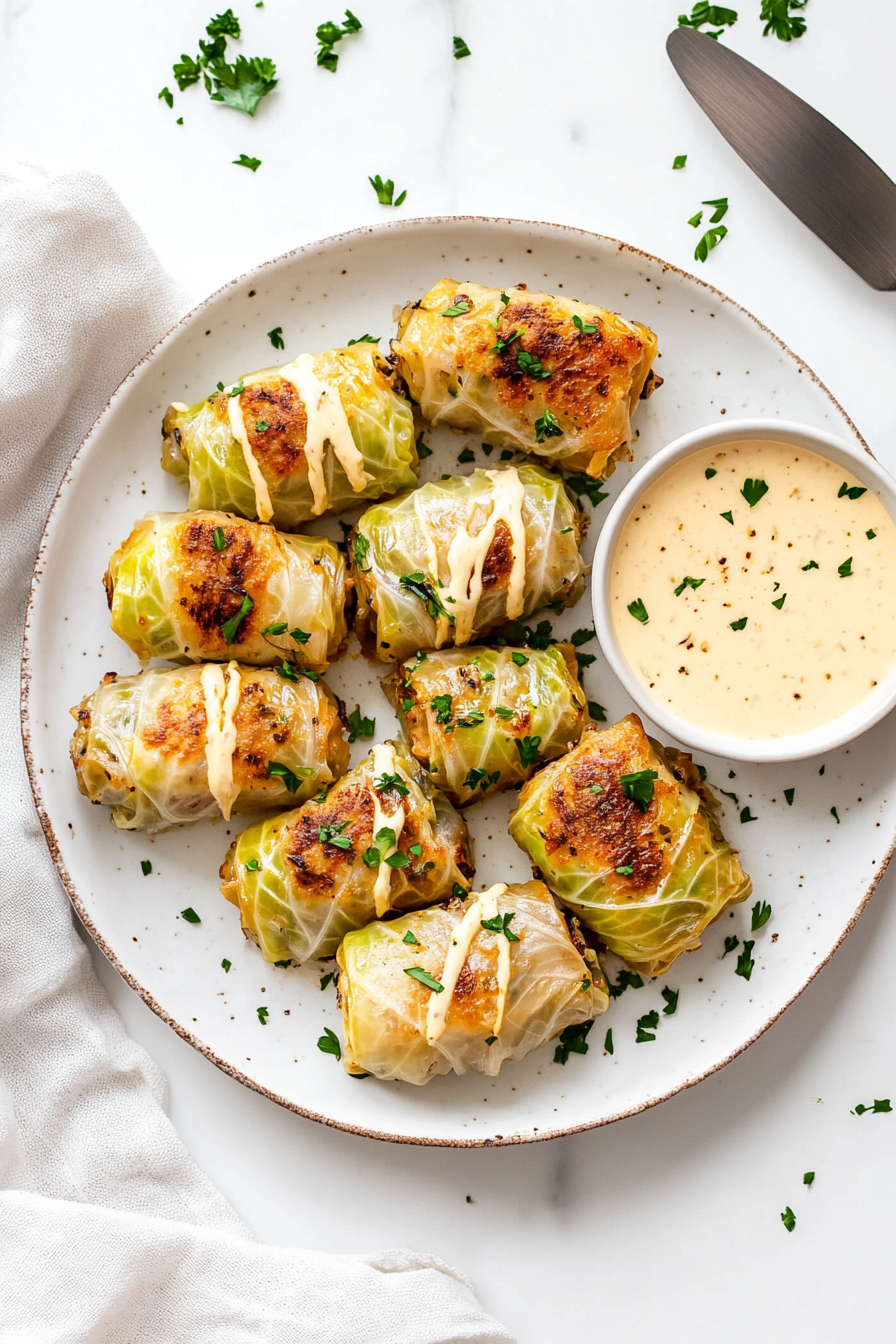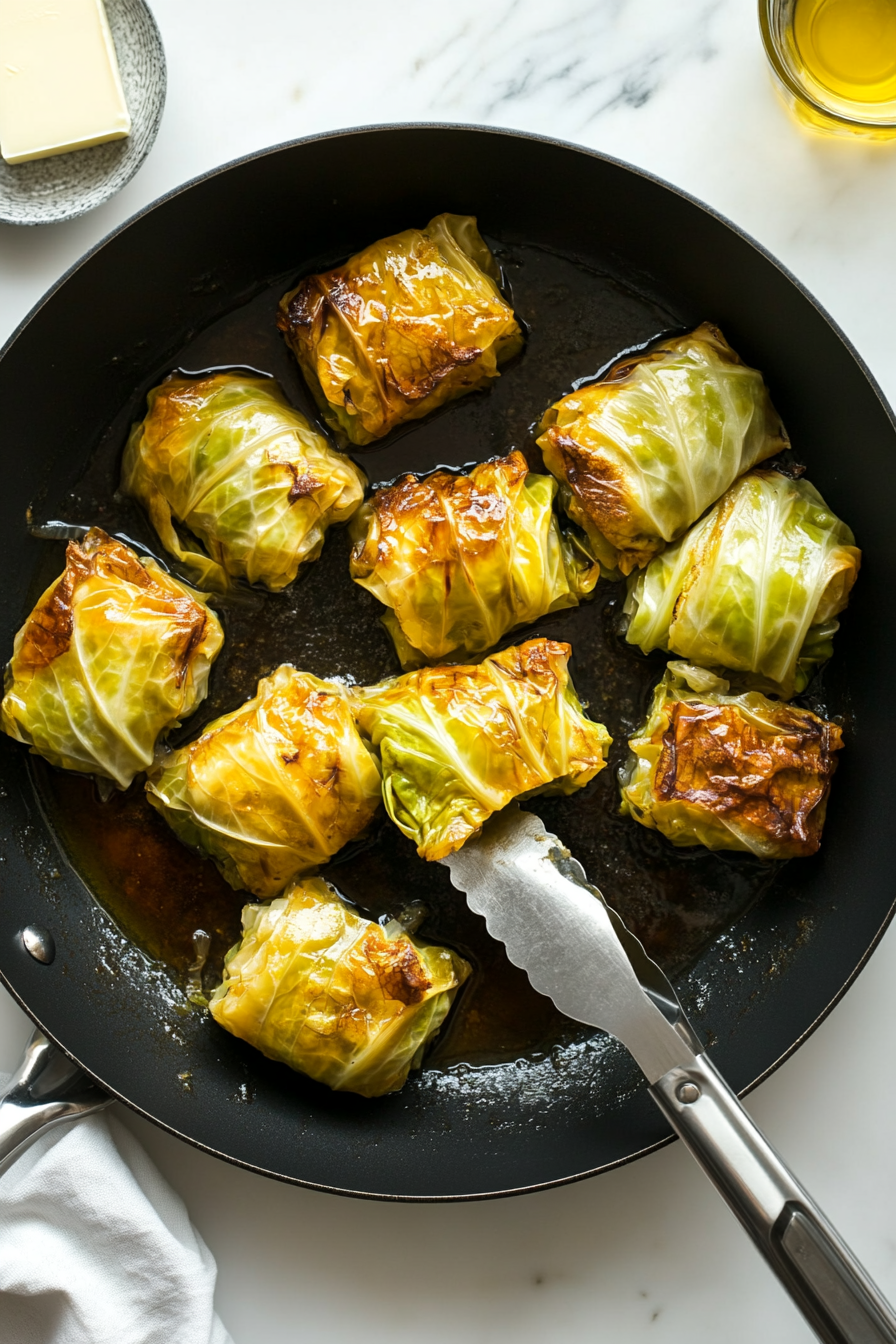 Mix the sautéed veggies with heavy cream, salt, and pepper, then fill each cabbage leaf and roll.