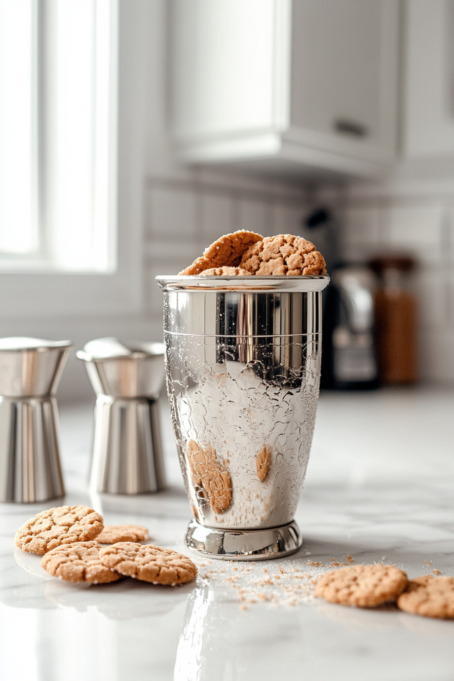 Add the crushed sugar cookies into the shaker, giving the mixture a cookie-like flavor and texture.