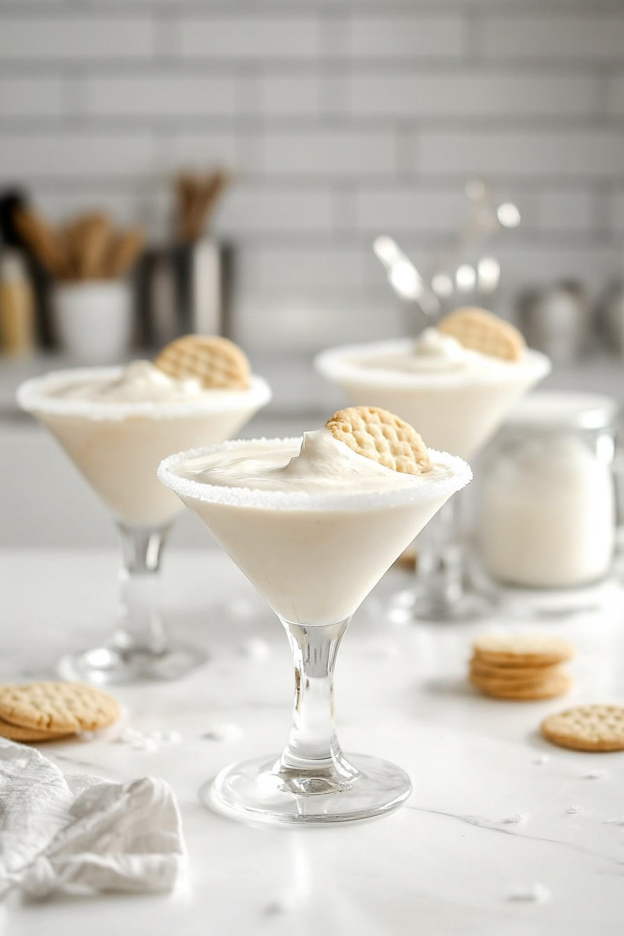 This dessert cocktail combines crushed sugar cookies with vanilla vodka, white crème de cacao, and cream for a playful and sophisticated drink. The mixture is shaken with ice until frosty and poured into chilled glasses, resulting in a creamy, crunchy, and visually appealing beverage. It’s a delightful treat that balances childhood nostalgia with adult elegance.