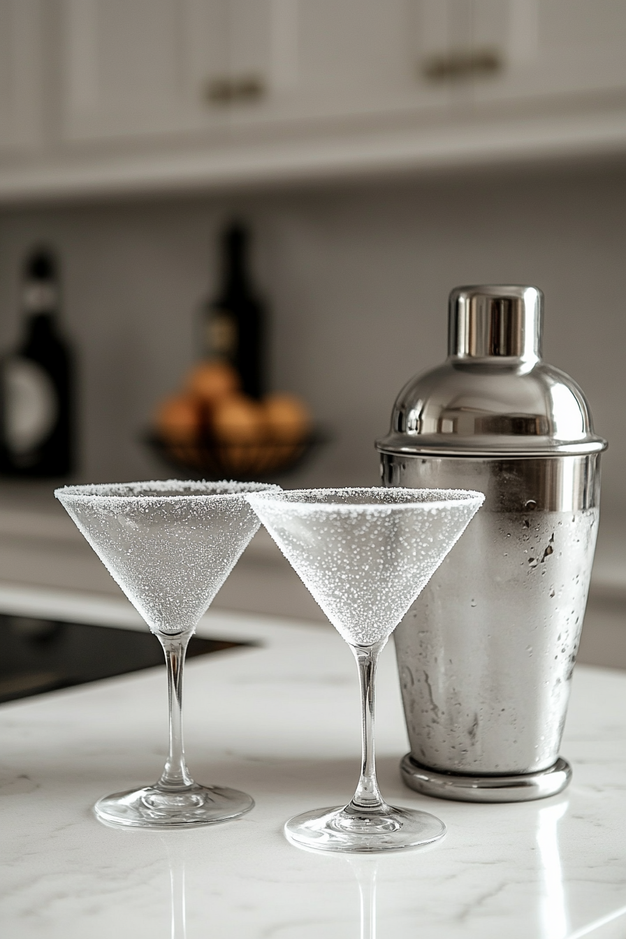 Start by chilling your martini glasses in the freezer for at least 15 minutes to keep your cocktail extra cold.