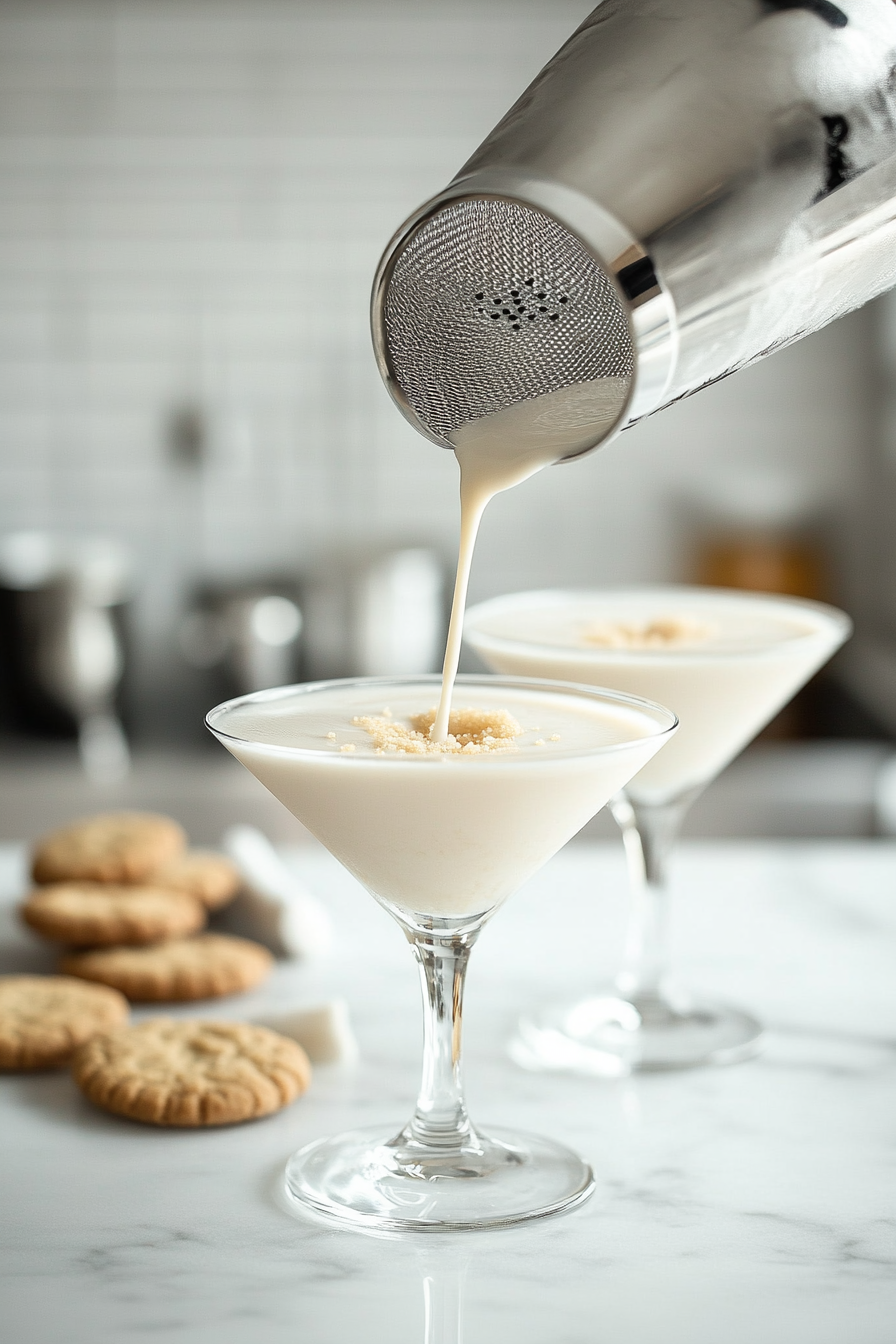 Strain the mixture into the glasses, catching any cookie crumbs or ice for a smooth, creamy pour.