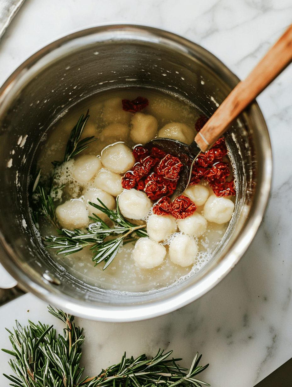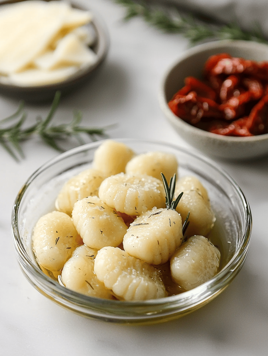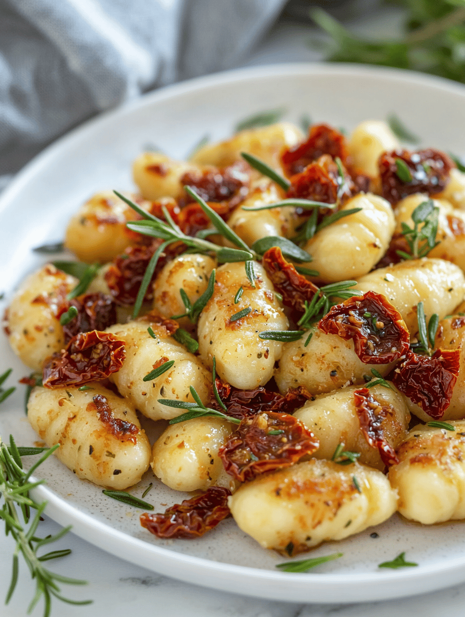This gnocchi recipe uses boiled potatoes combined with ricotta cheese, sun-dried tomatoes, and fresh herbs to create a light, pillowy pasta. The dough is gently shaped into individual dumplings, which are boiled until tender and glossy, then served with a fragrant rosemary-infused olive oil sauce, resulting in soft, chewy bites with vibrant seasonal flavors.