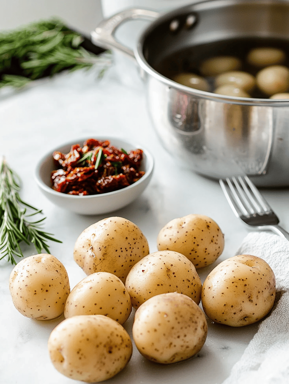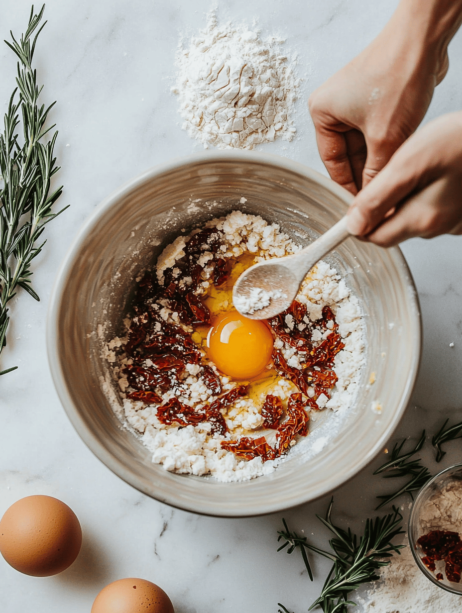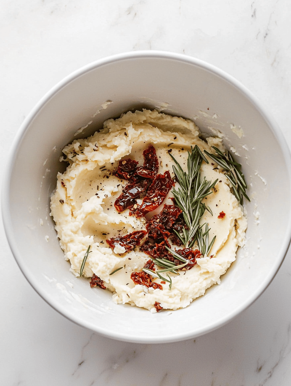 Combine the mashed potatoes with ricotta cheese, chopped sun-dried tomatoes, and chopped rosemary in a large mixing bowl. Mix gently until well incorporated, creating a fragrant, sticky mixture.