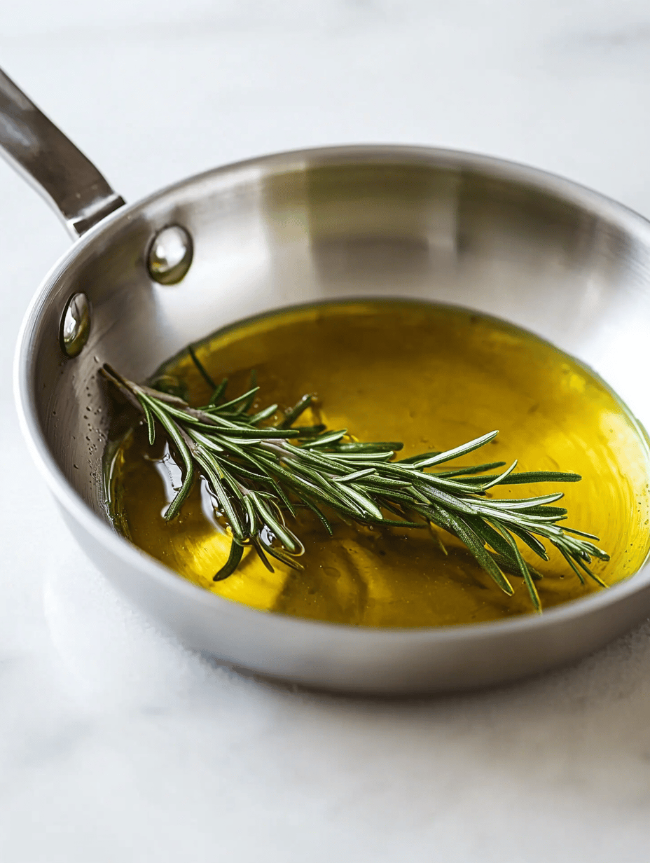 Meanwhile, pour olive oil into a frying pan over low heat. Add a small sprig of rosemary and warm the oil gently to infuse its aroma. Remove the rosemary before proceeding.