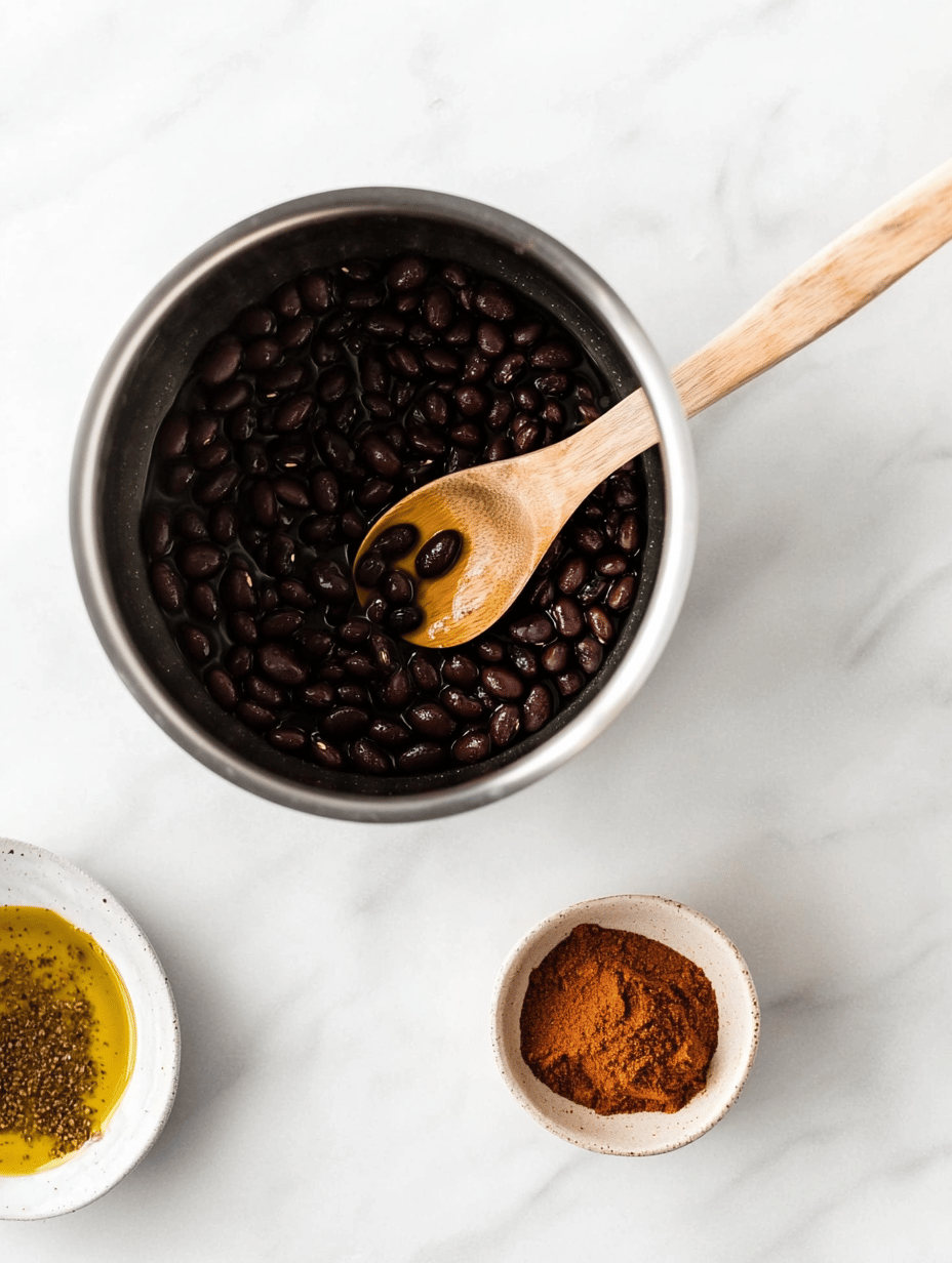While the sweet potatoes roast, rinse and drain the black beans. In a large pot, sauté a spoonful of olive oil over medium heat, then add the cumin and smoked paprika. Let the spices bloom for about 30 seconds until fragrant, creating a warm, smoky aroma.