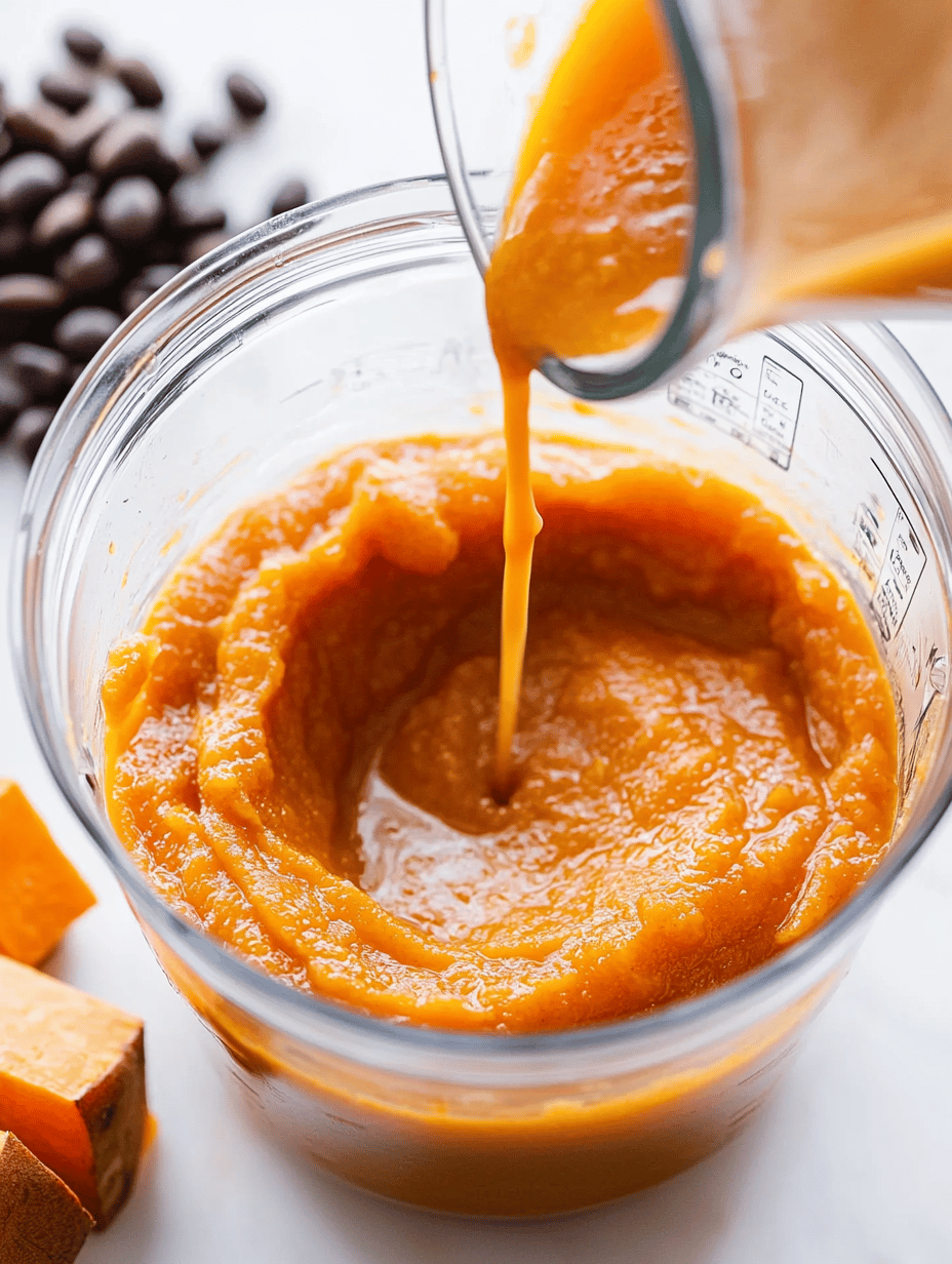 Once the sweet potatoes are ready, transfer them to a blender or food processor. Pour in a cup of hot vegetable broth, then blend until smooth and velvety. This creates a bright orange, silky puree that forms the base of the soup.