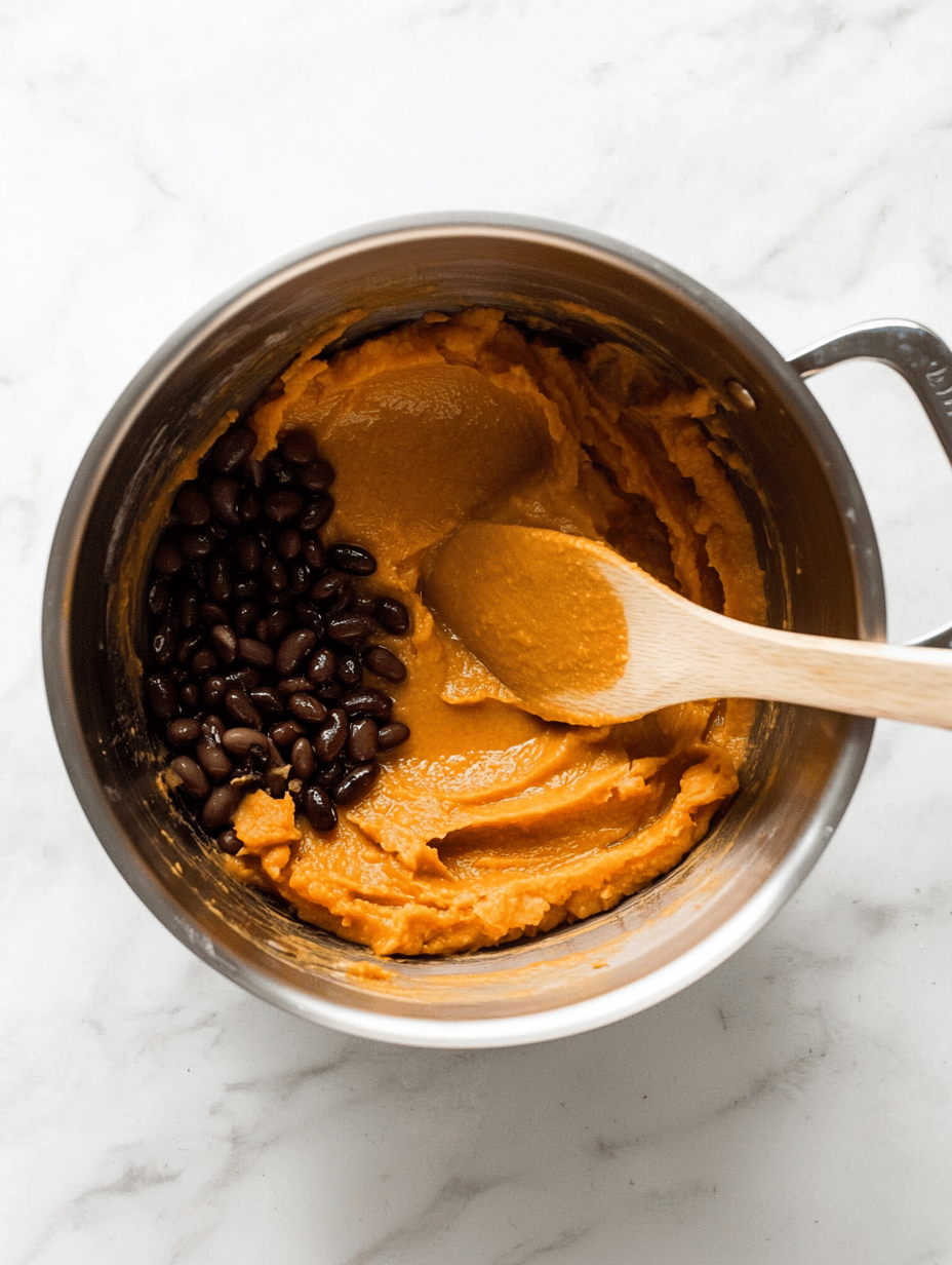 Pour the sweet potato puree into the pot with the spiced broth. Add in the rinsed black beans and the remaining 2.5 cups of broth. Gently stir everything together, bringing the mixture to a simmer so the flavors meld beautifully.