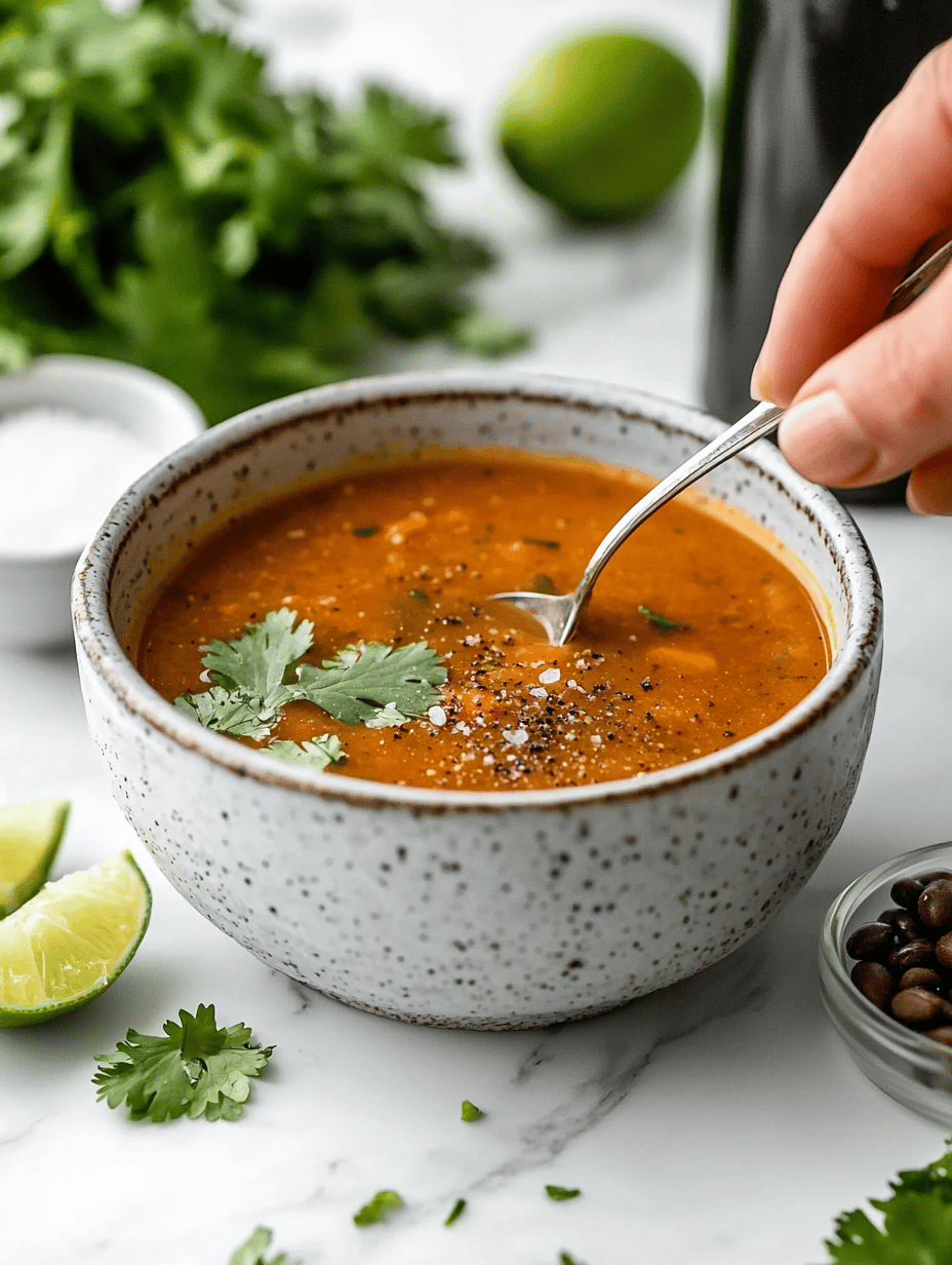 Taste the soup and season with salt and pepper as needed. If desired, add a splash more broth or lime juice to adjust the flavor and consistency. Serve hot, garnished with a squeeze of extra lime or fresh herbs if you like.