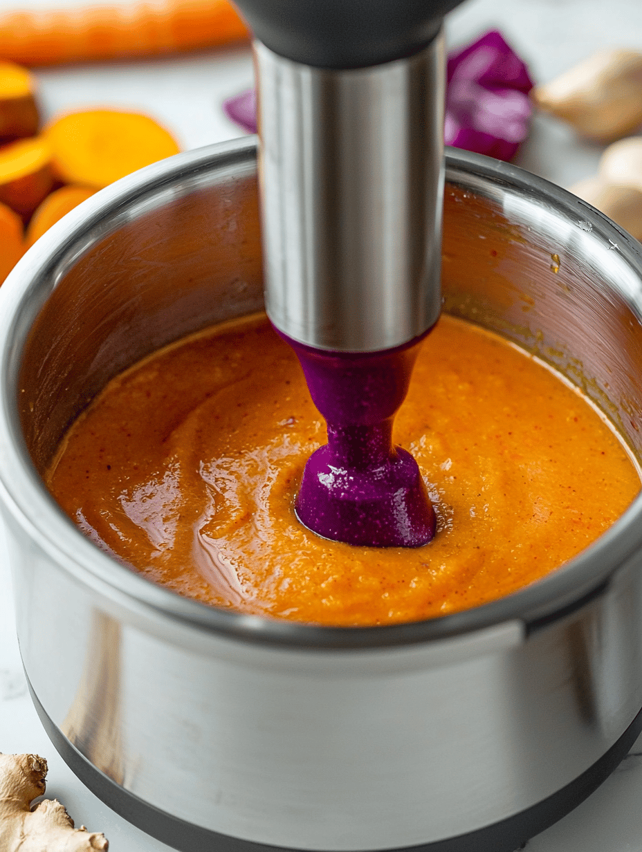 Once cooked, use an immersion blender directly in the slow cooker or transfer the mixture to a blender. Puree until the soup is smooth and velvety.