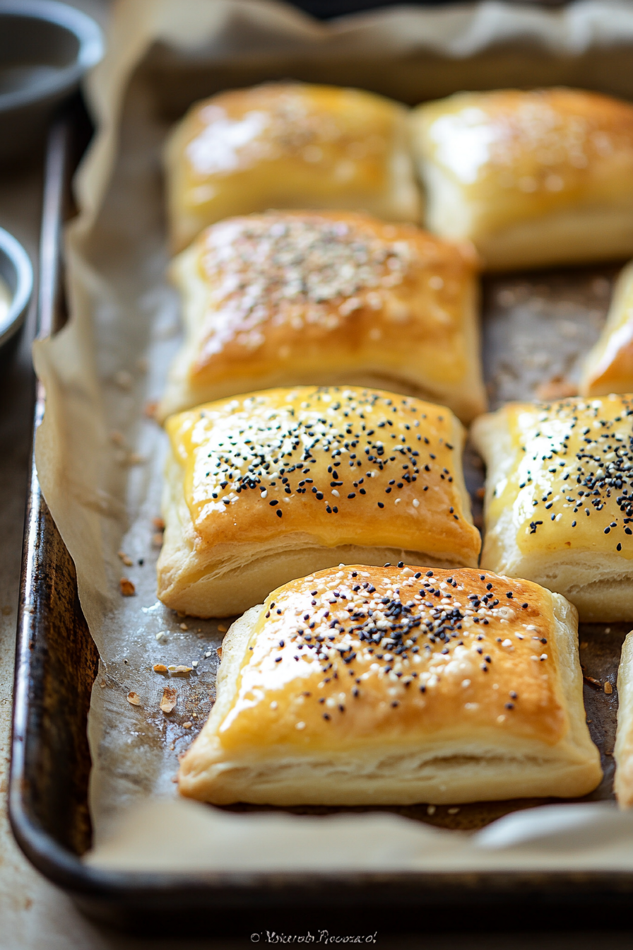 Prepare for Baking: Place the bourekas on a baking sheet lined with parchment paper, brush with egg wash, and sprinkle with sesame or poppy seeds.