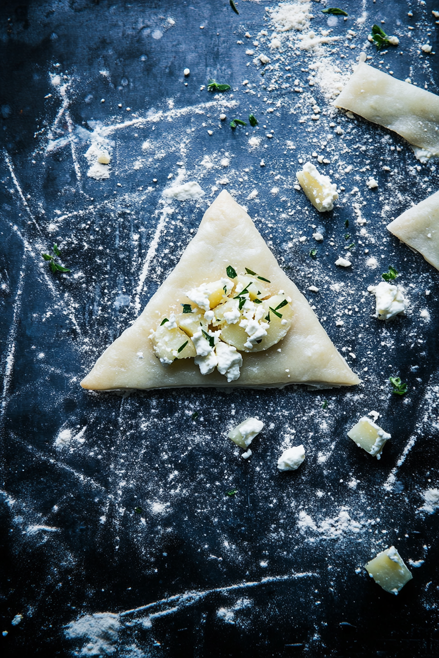 Fill Pastry Squares: Place 1 tablespoon of the potato-feta filling on each square, shaping it into a triangle, 1/4 inch from the edge.