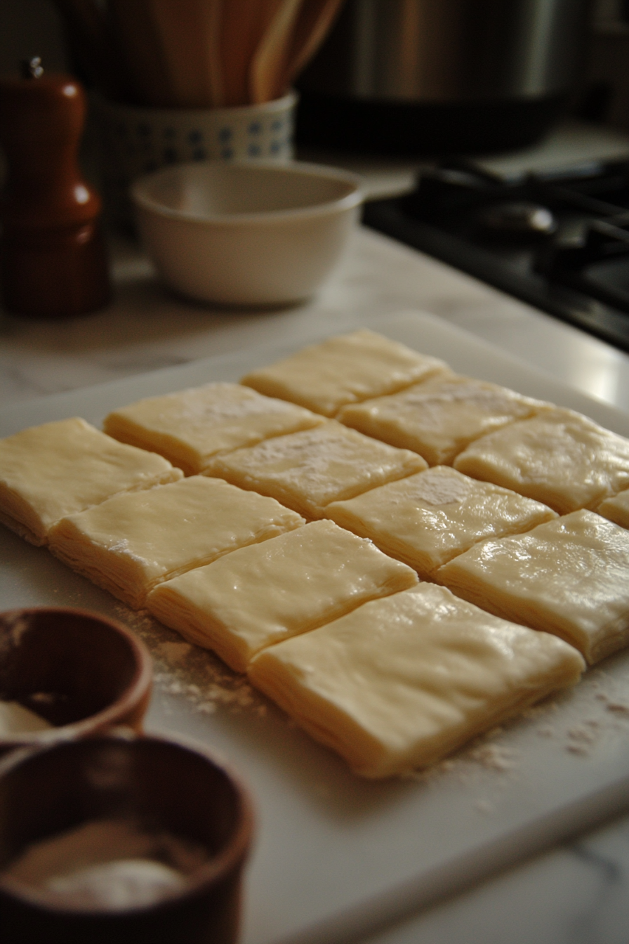 Prepare Puff Pastry: Preheat the oven to 350°F. Roll out puff pastry on a lightly floured surface to a 12x12 inch square. Cut into 9 equal squares.