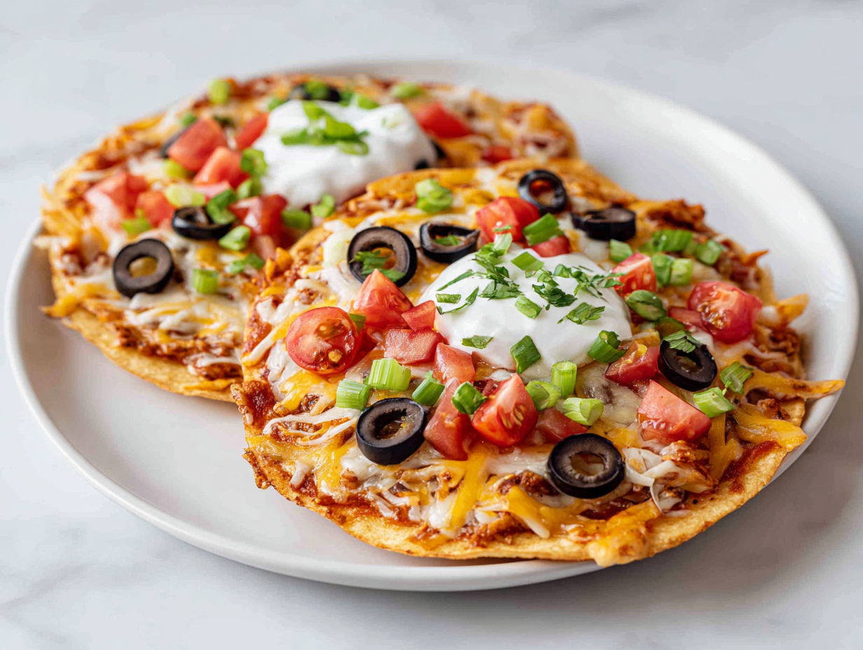 Top with diced tomatoes, green onions, sliced olives, and a dollop of sour cream. Serve hot.