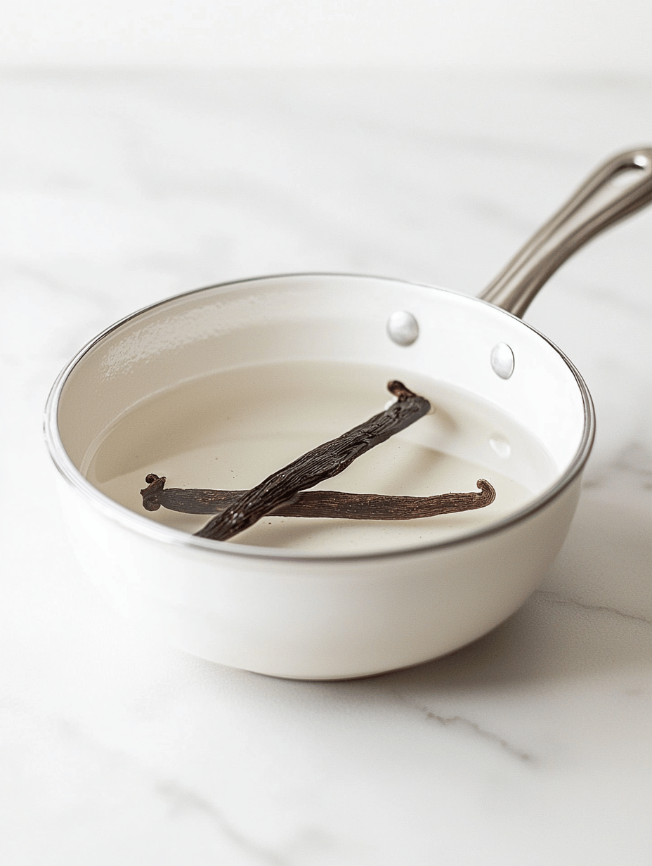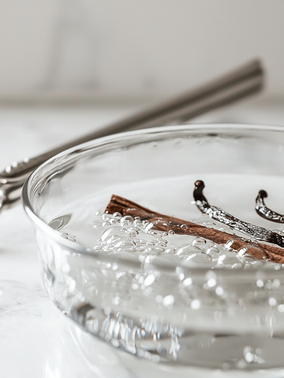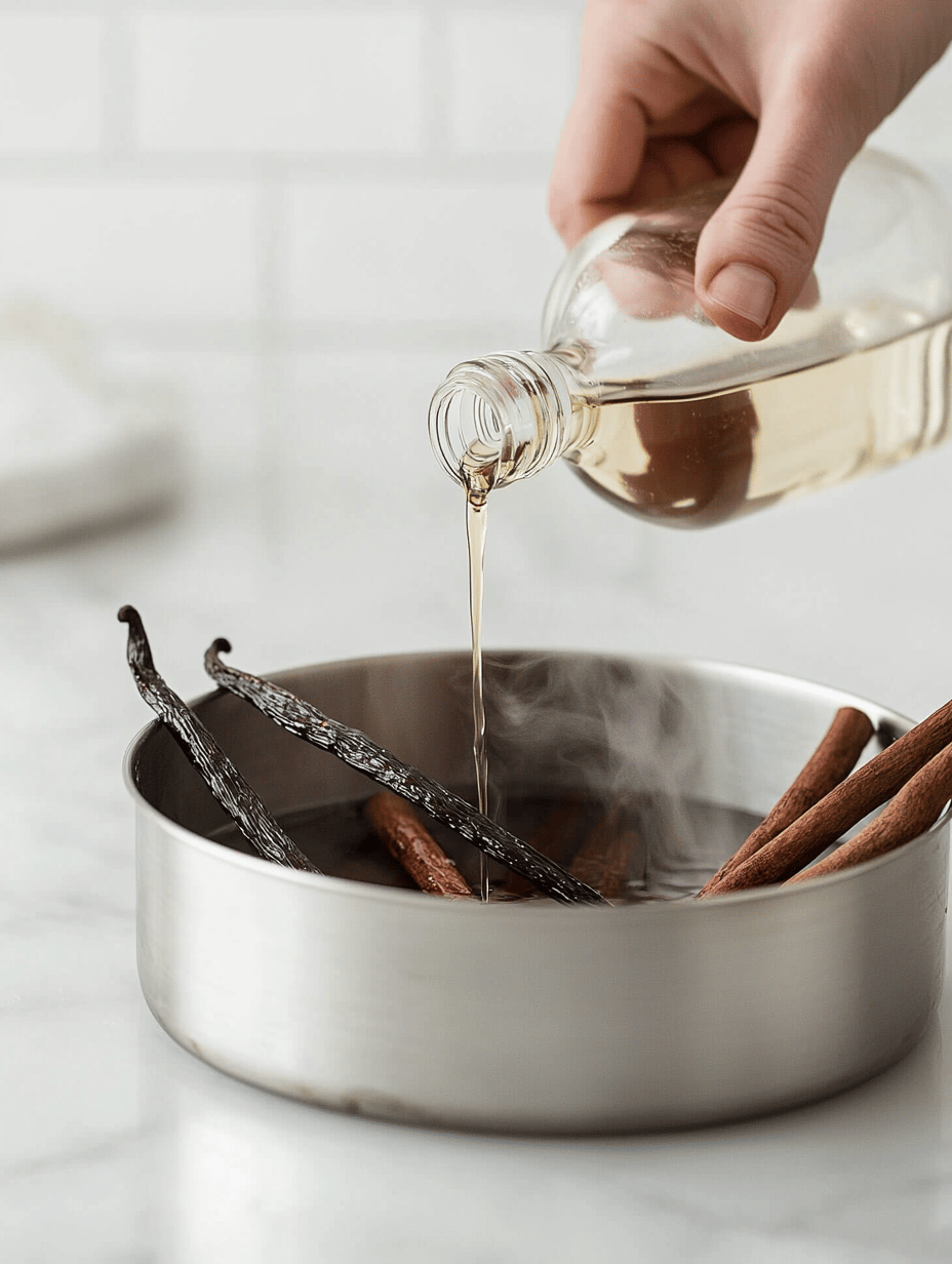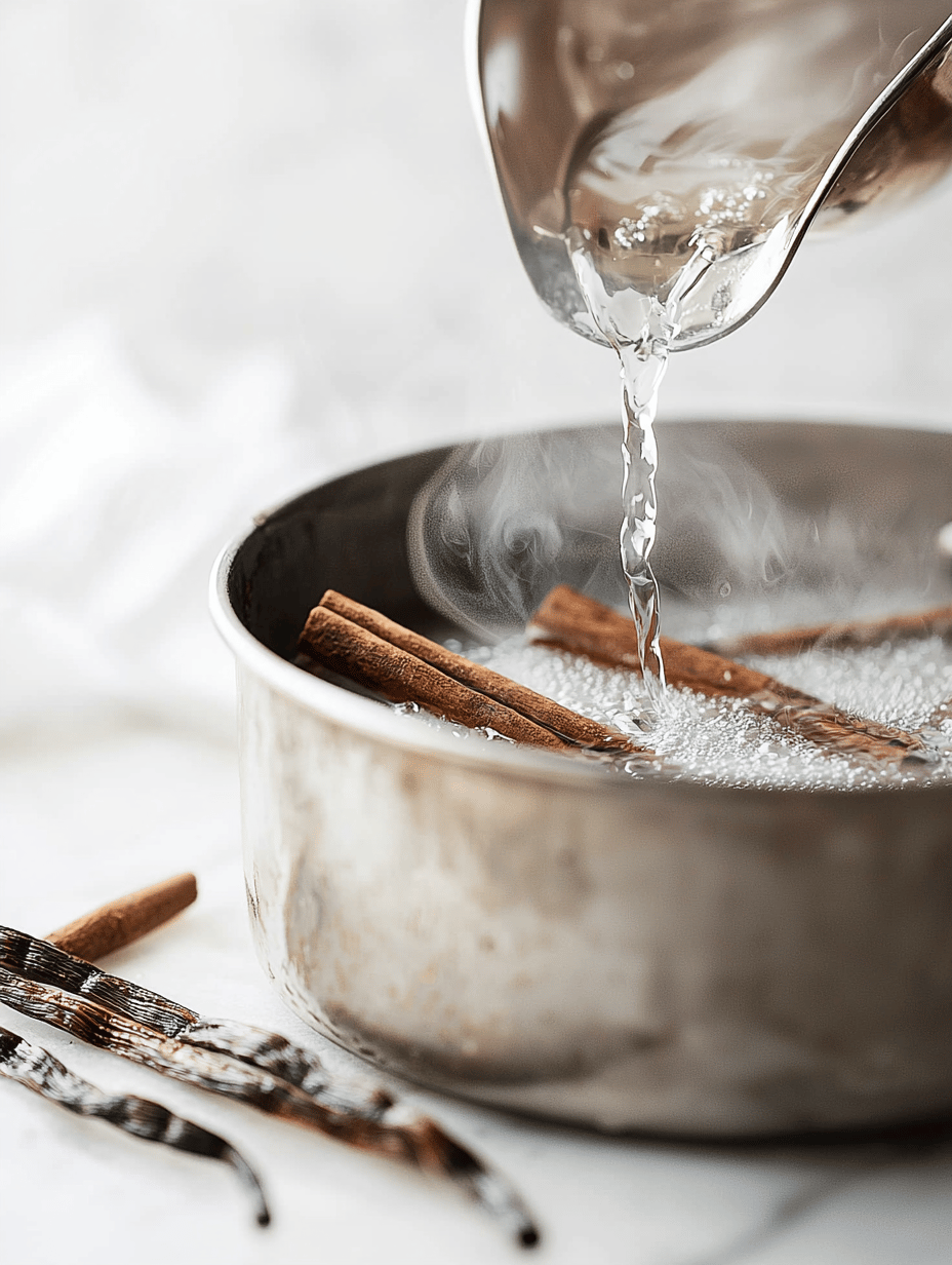 Stir in the vanilla extract, releasing a sweet, fragrant aroma as it mixes into the simmering water.