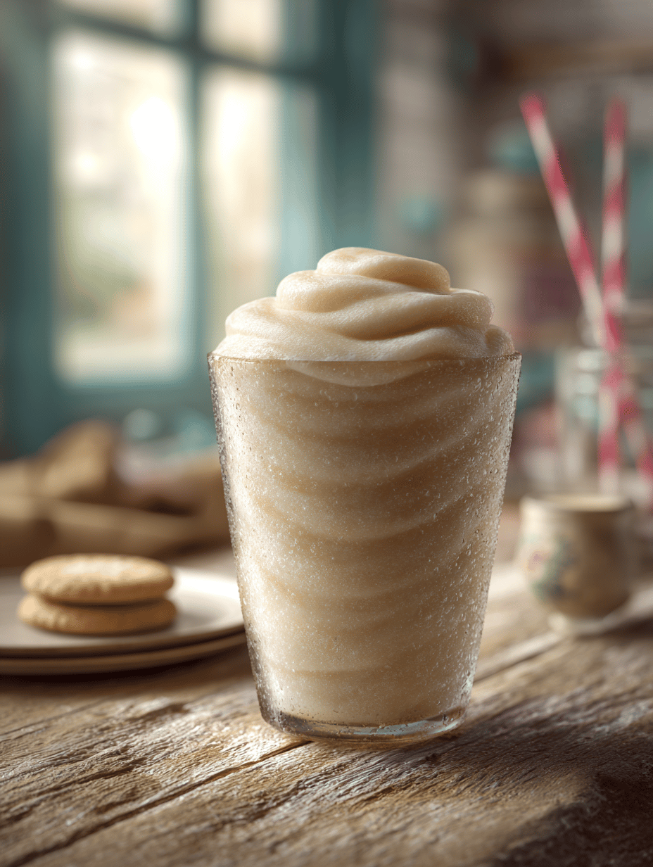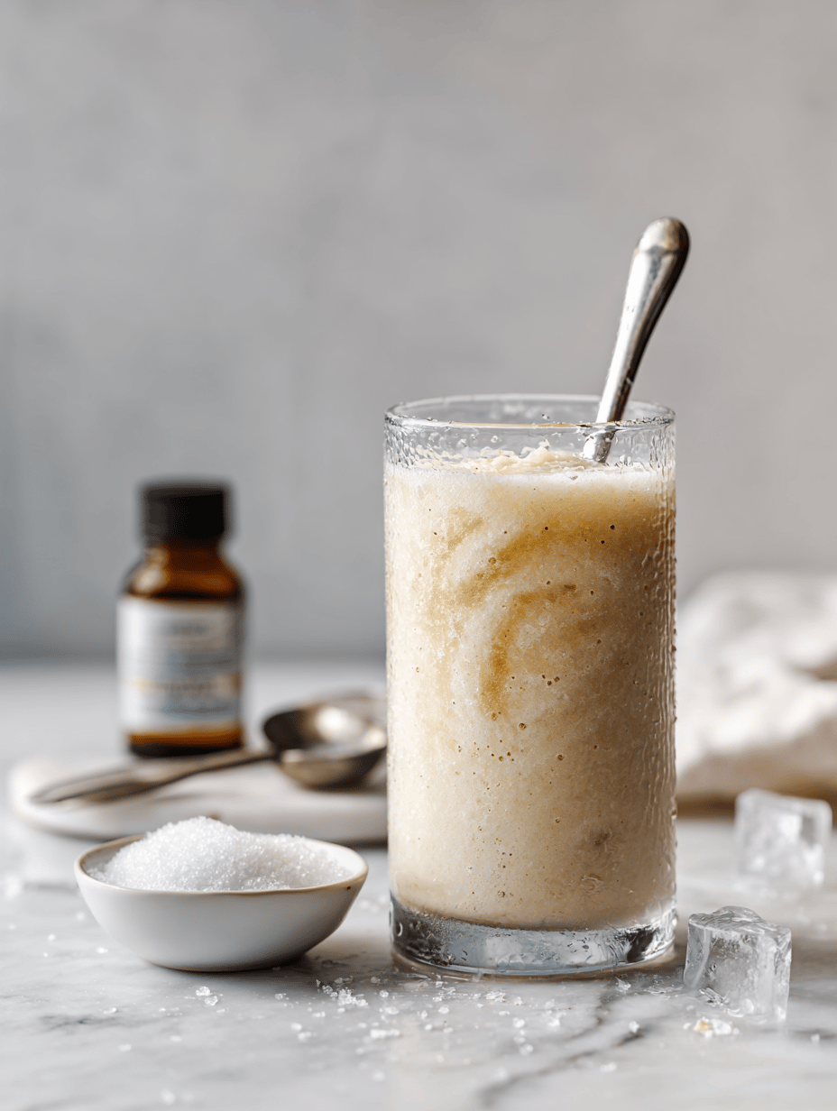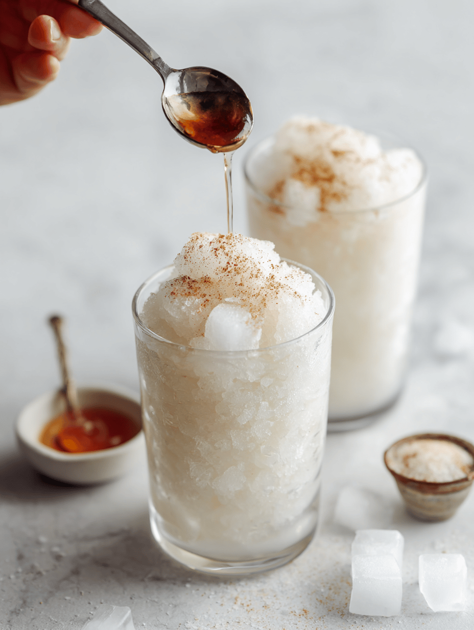 Serve immediately with a straw or spoon, enjoying the icy, vanilla-scented refreshment.