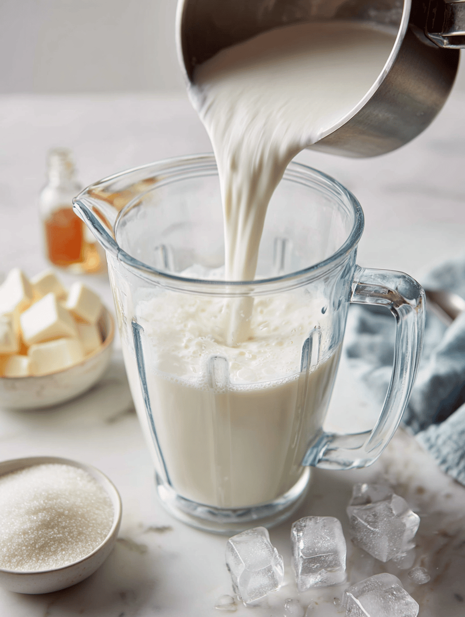 Pour the milk into your blender, creating a smooth, liquid base.