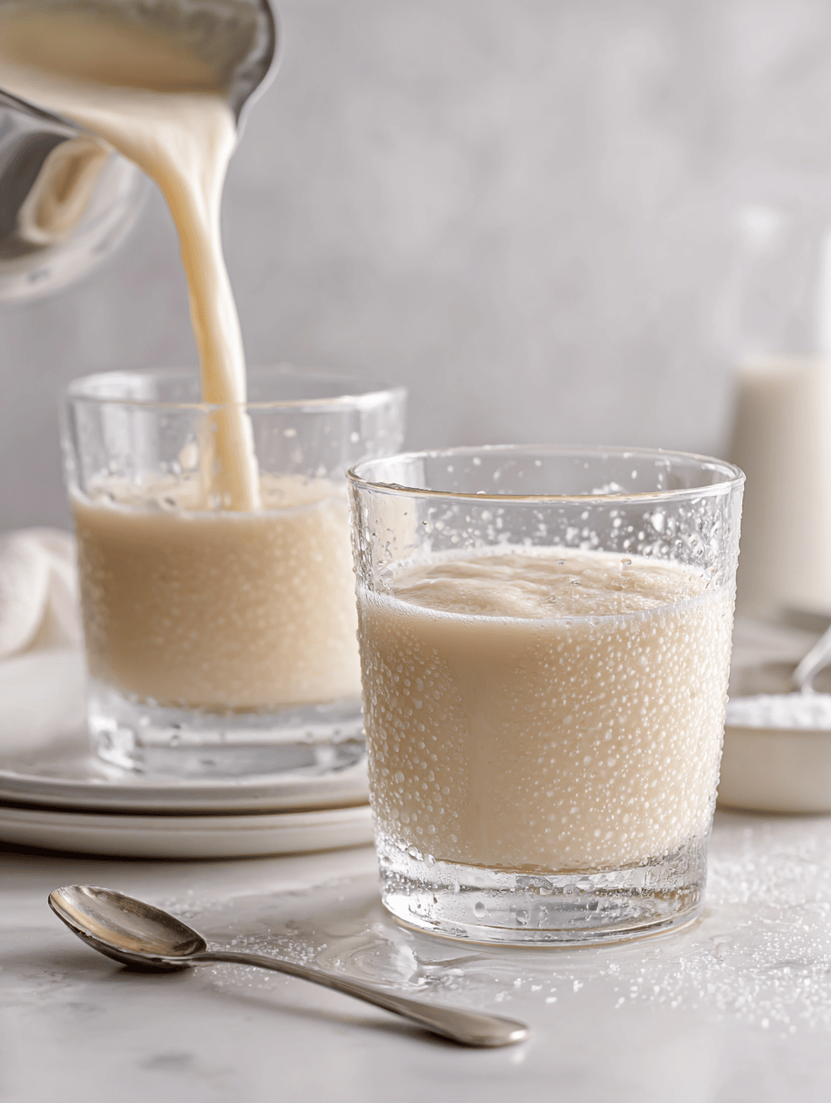 Pour the icy vanilla mixture into glasses, feeling the cold, creamy texture and seeing the pale, frosty appearance.
