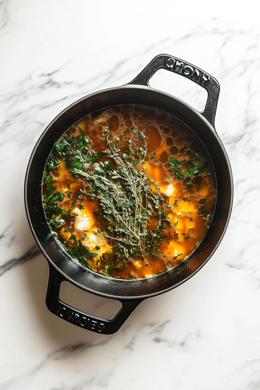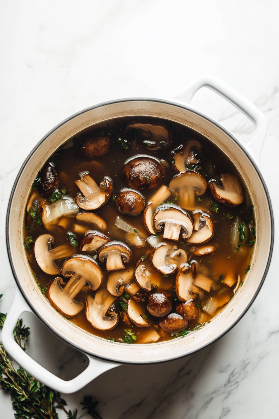 Prepare the broth by bringing 5 cups of water to a boil, adding dried mushrooms and veggie base, stirring well, then removing from heat.