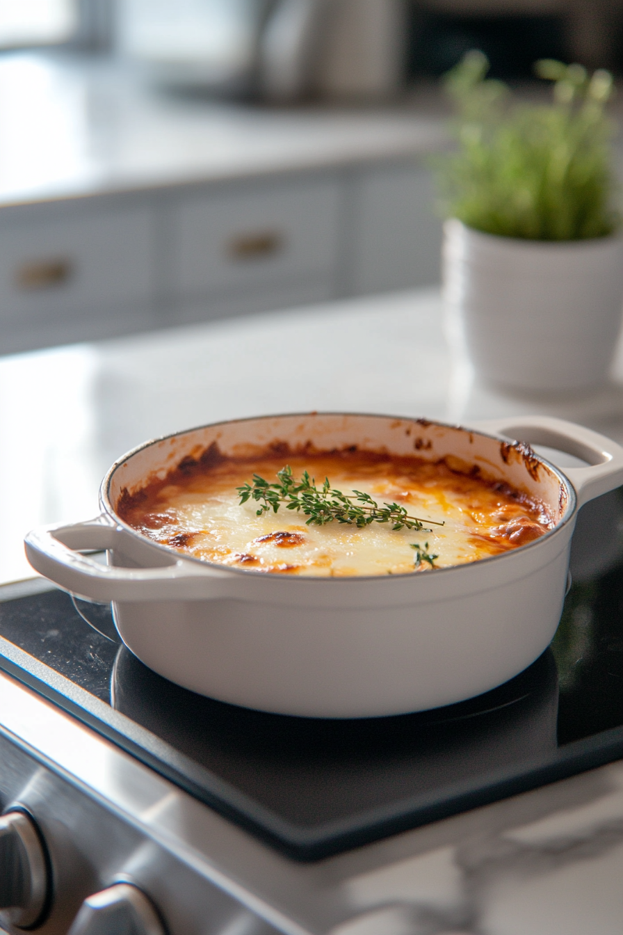 Add the broth, thyme bundle, and soy sauce; simmer for another 15-20 minutes. Ladle into crocks, top with toasted baguette and vegan cheese, then broil until melted. Serve hot.