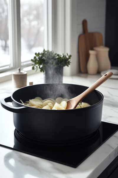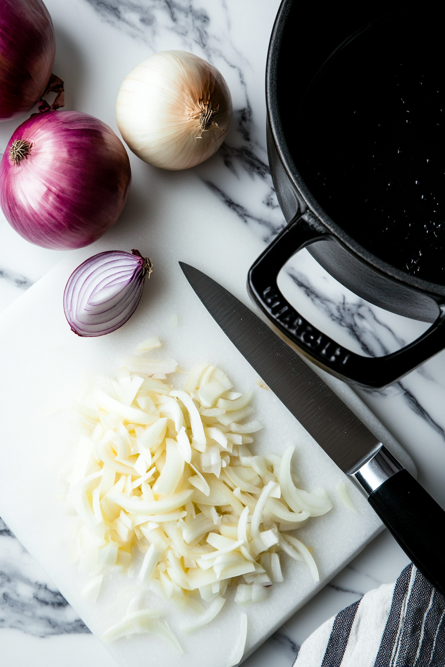 Slice onions in half from root to tip, remove the skins, then thinly slice from root to tip and add to a large Dutch oven.